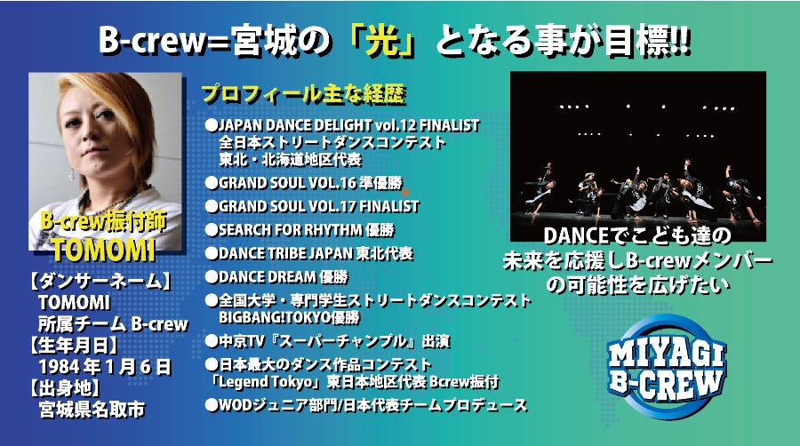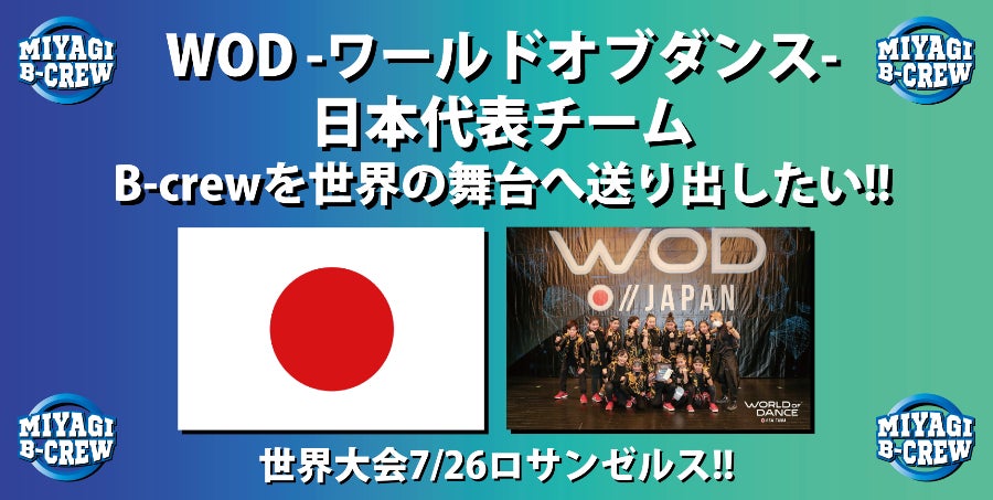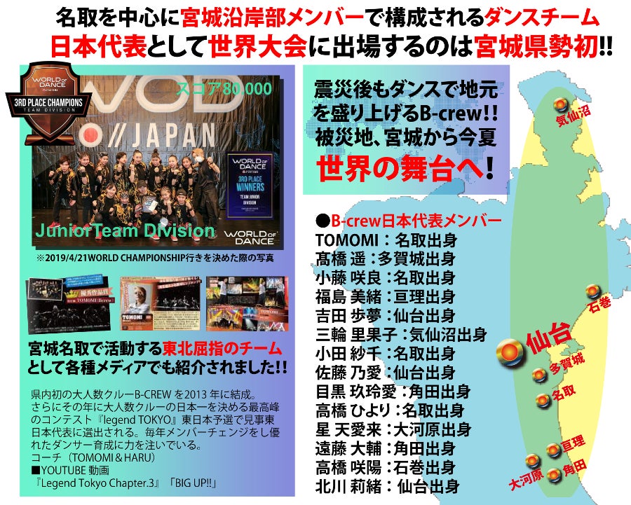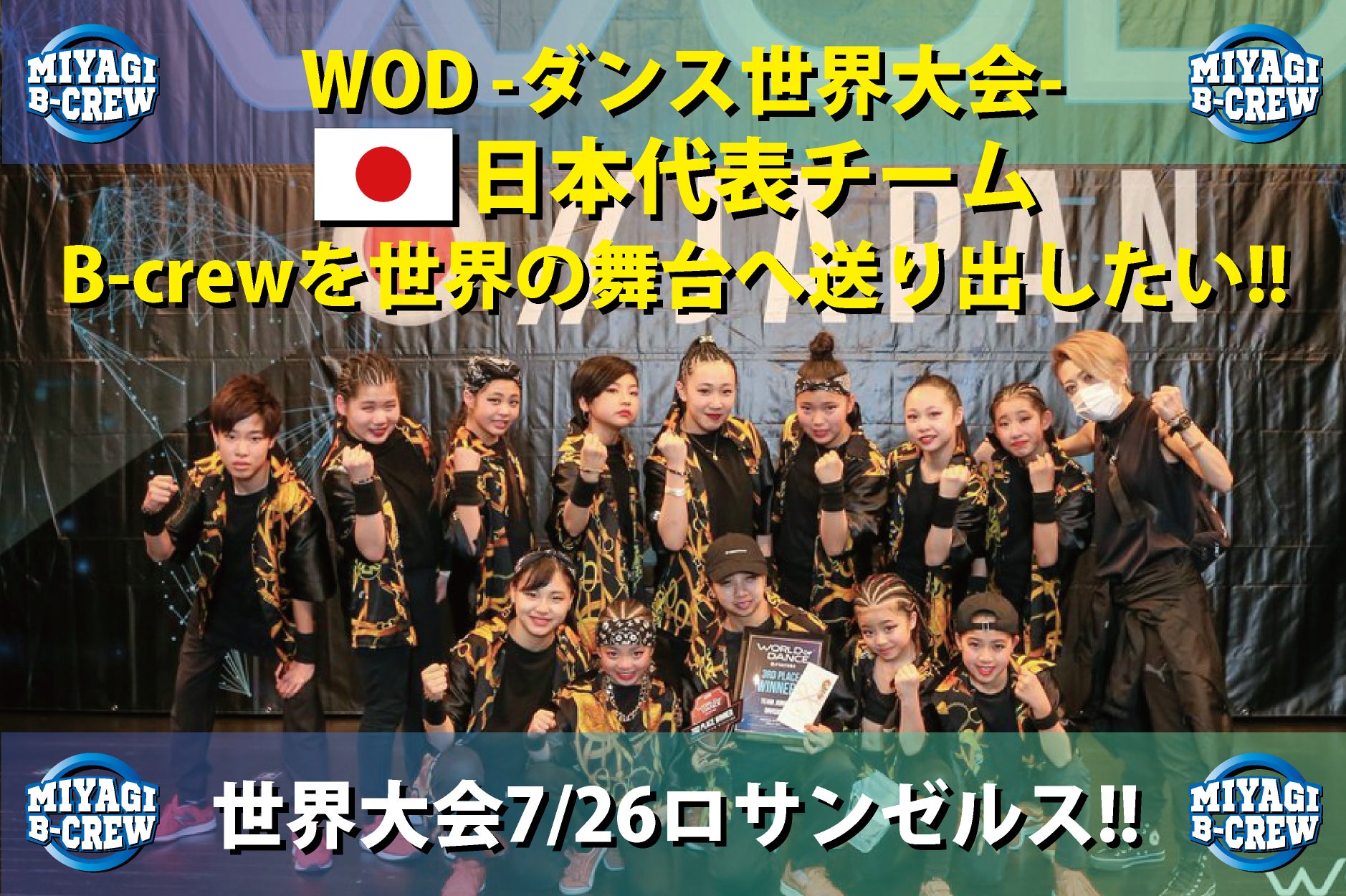 東日本大震災被災地、宮城沿岸部メンバーで構成されたダンスチーム『B-crew』が今夏、宮城初の日本代表チームとしてロサンゼルスで開催される、ダンス世界大会 -WOD- WorldOfDanceに挑戦します。日本中の方にこの活動を通じて世界に挑戦するこどもたち、そして被災地のダンスを是非知ってもらいたい!