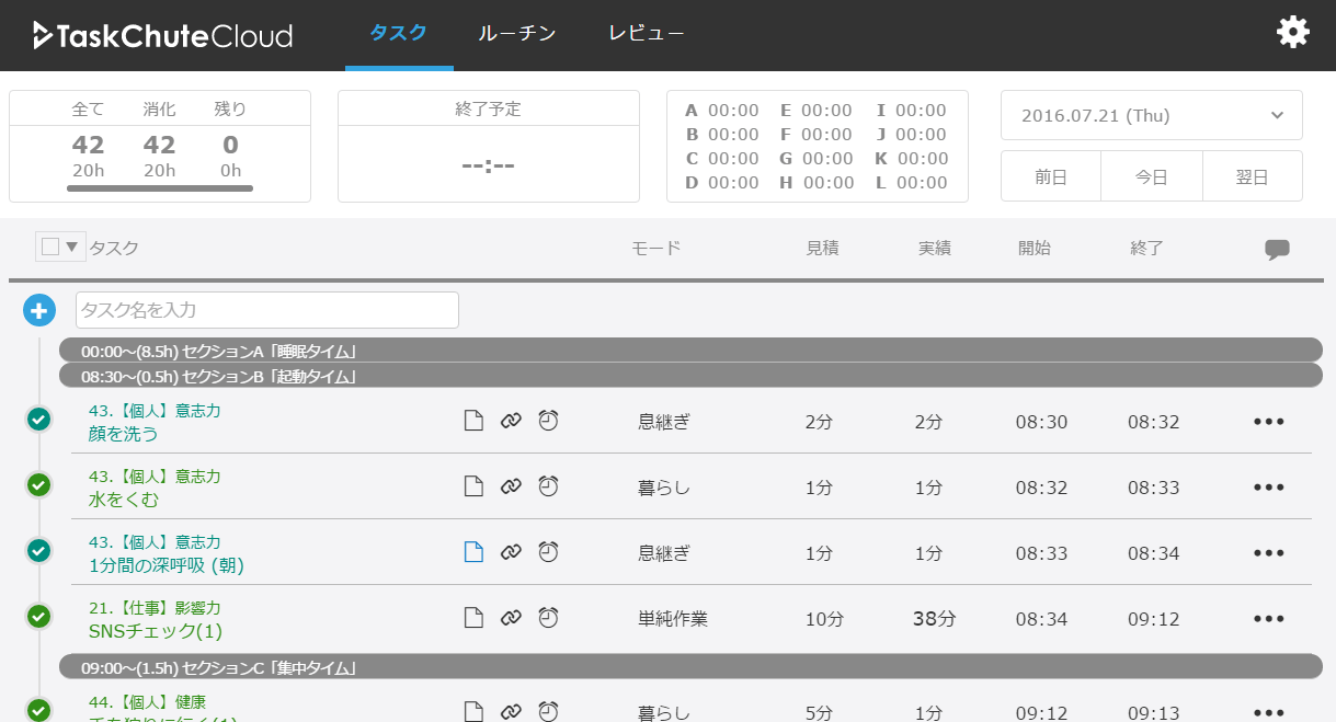 文字通り、朝から晩まで1日中TaskChute Cloudと共に過ごしています。