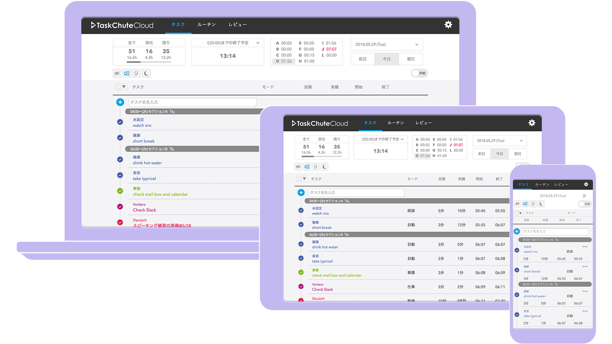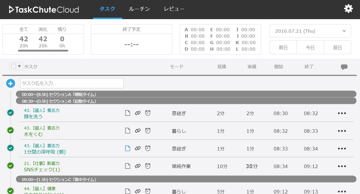 TaskChute Cloudは前日までの実績をもとに行動予定を組むことができるので、生活サイクル作りにとても役立っています。