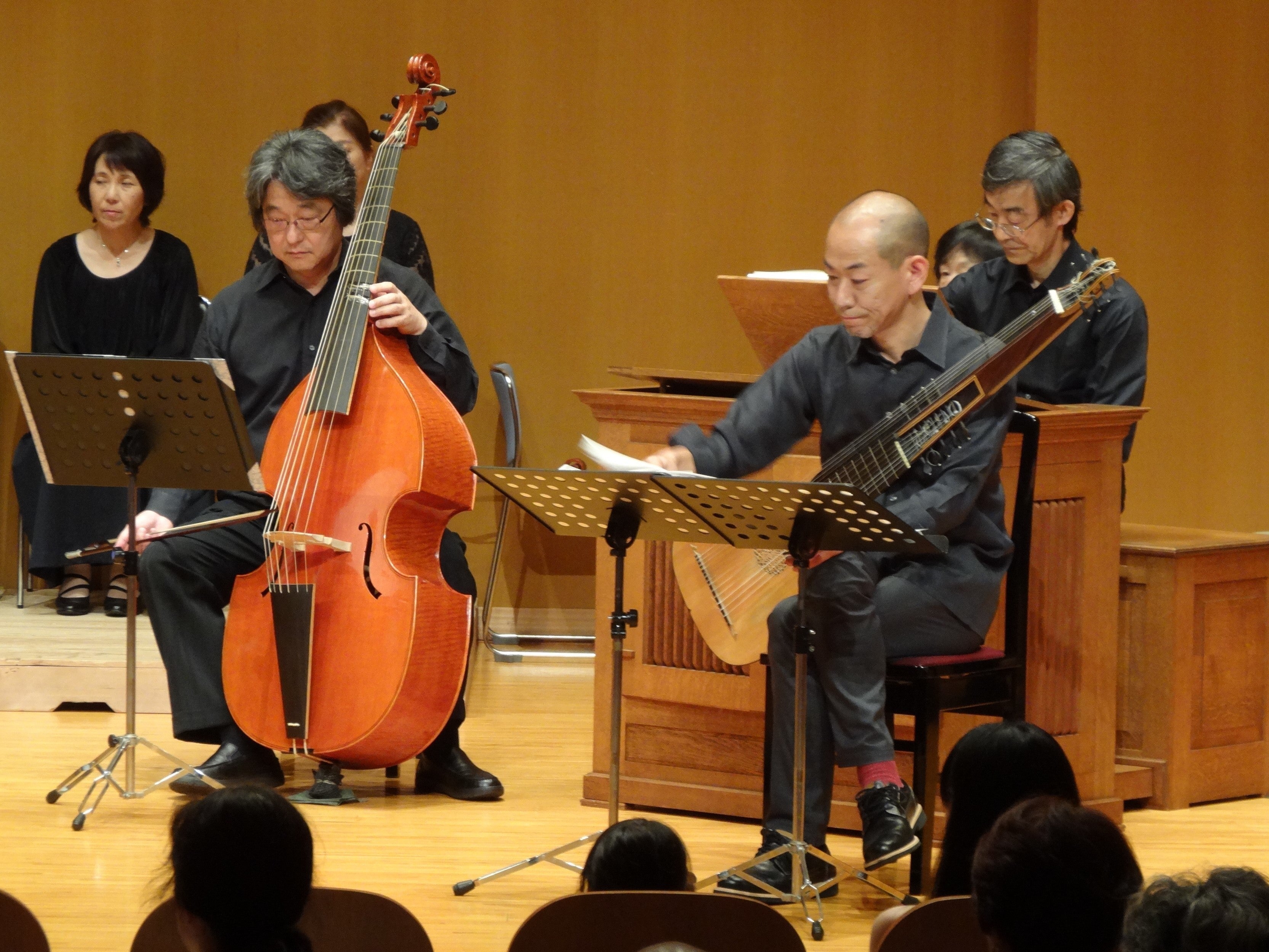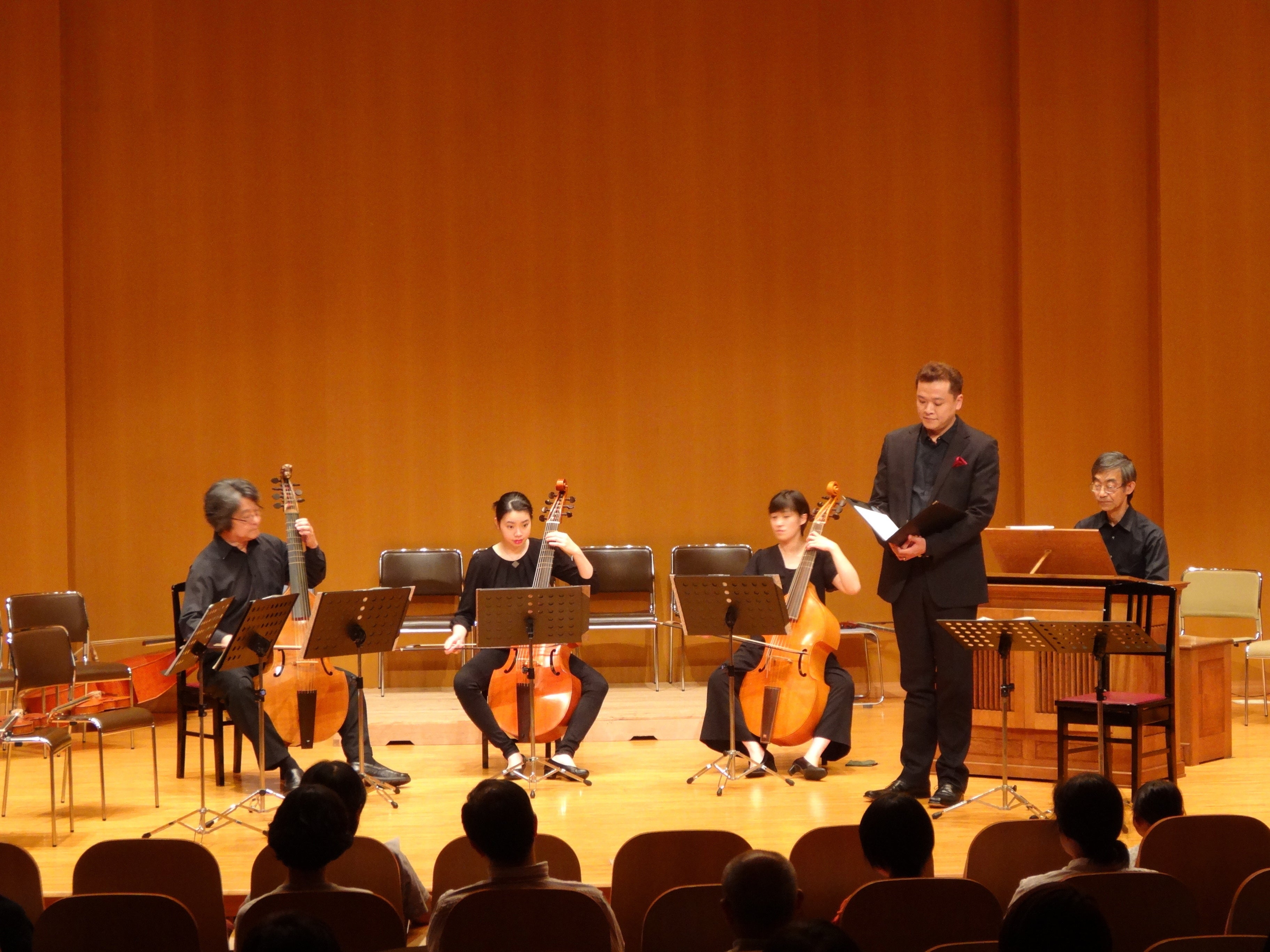 第6曲目、「心について」はガンバ4挺とヴィオローネによるコンソートで歌われました。(上写真)