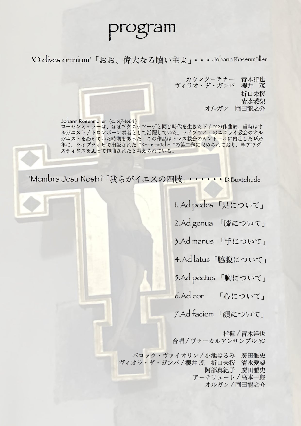 プログラム1曲目は指揮者でもある、カウンターテナー青木洋也氏と櫻井茂氏らガンバコンソートによるローゼンミュラーの「O dives omnium」’おお、偉大なる贖い主よ’ でした。(上写真)