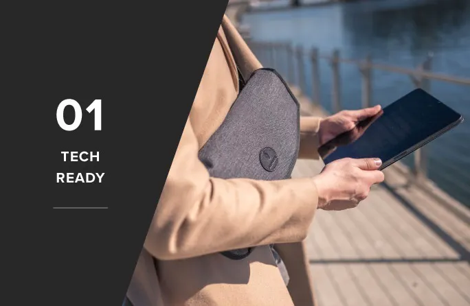 メッセンジャーバッグ「Alpha」は、スマホやタブレットなどのハイテクギアを携帯する現代のライフスタイルを意識してデザインされています。13インチのMacBookや12.9インチのiPad Proをすっきり収納できる専用コンパートメントは緩衝パッド付なので、大切なタブレットを安心して持ち運べます。