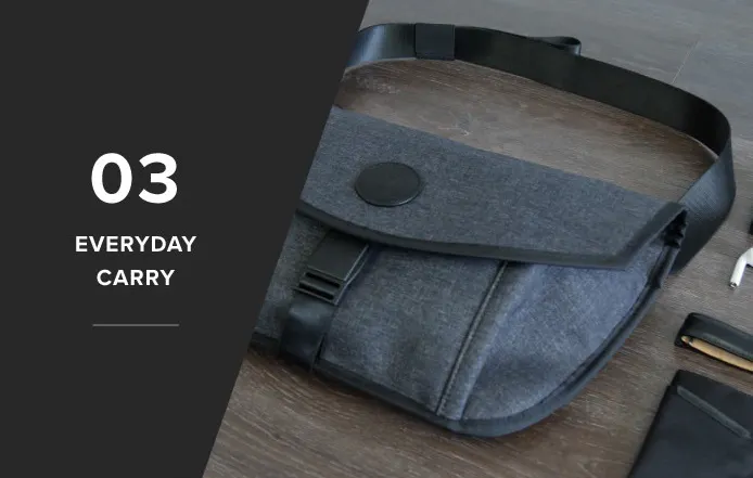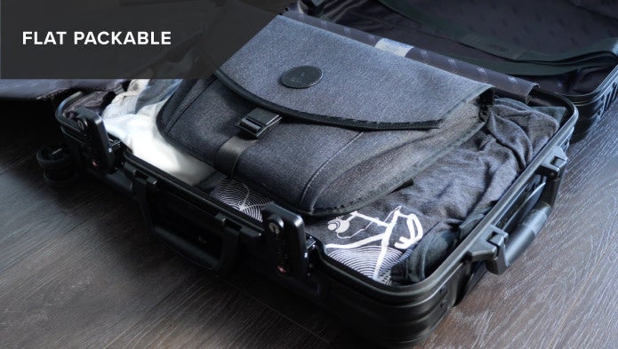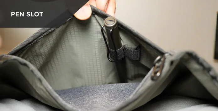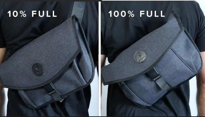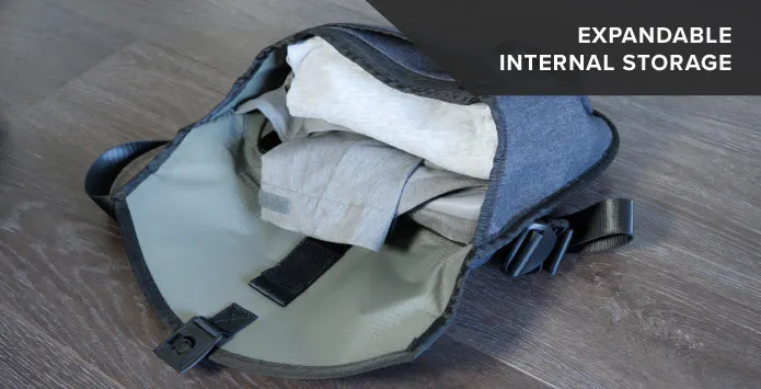 スリムな外見に反して、これだけたくさんのものを収納できるメッセンジャーバッグ「Alpha」。その秘密は主要コンパートメントと3つのポケット、荷物量に応じてフレキシブルに広がるマチにあります。