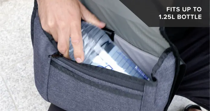 暑い季節は水分補給が欠かせません。メッセンジャーバッグ「Alpha」なら1.25リットルのペットボトルも持ち運べます。