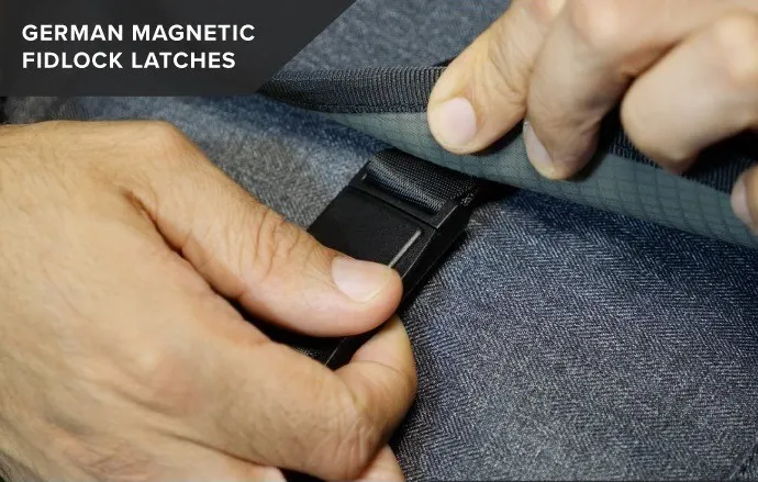 フロントのフラップにはFidlock社のマグネットラッチを採用。磁力でひとりでに閉まりますが、開けるときは横にスライドする必要があるので、防犯効果があります。