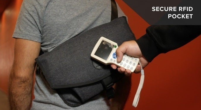メッセンジャーバッグ「Alpha」のポケットは、RFIDをブロックしてスキミングを防止します。