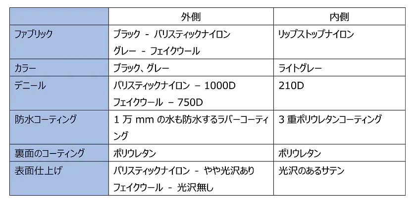 カラーはグレー(左・素材はフェイクウール)とブラック(右・素材はバリスティックナイロン)の2色から選択できます。