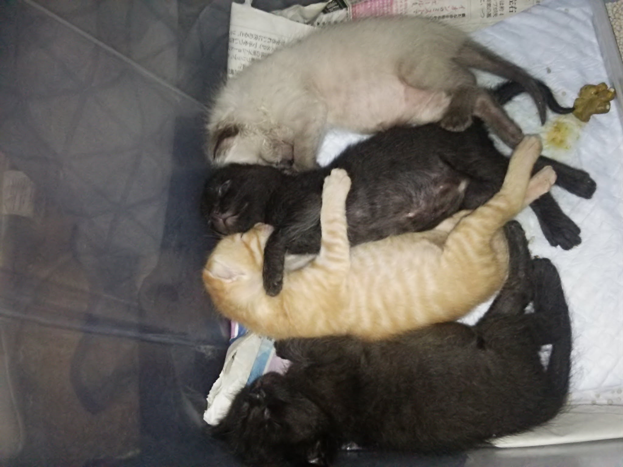次に忘れられないのは、河原を散歩していると川に買い物袋に何か入ってるものが流れてきたので枝で手繰り寄せ持ち上げると動物の毛らしいものが見えました。恐る恐る開けてみるとへその緒がついたままの子猫が5匹入っていて1匹は息絶えていましたが4匹はかろうじて息をしていたので連れて帰り自宅にあった犬の粉ミルクを与えて温めて、翌日からは猫の粉ミルクを2時間おきに与えて4匹とも無事成長してくれ、里親さんの元に行くことができました。