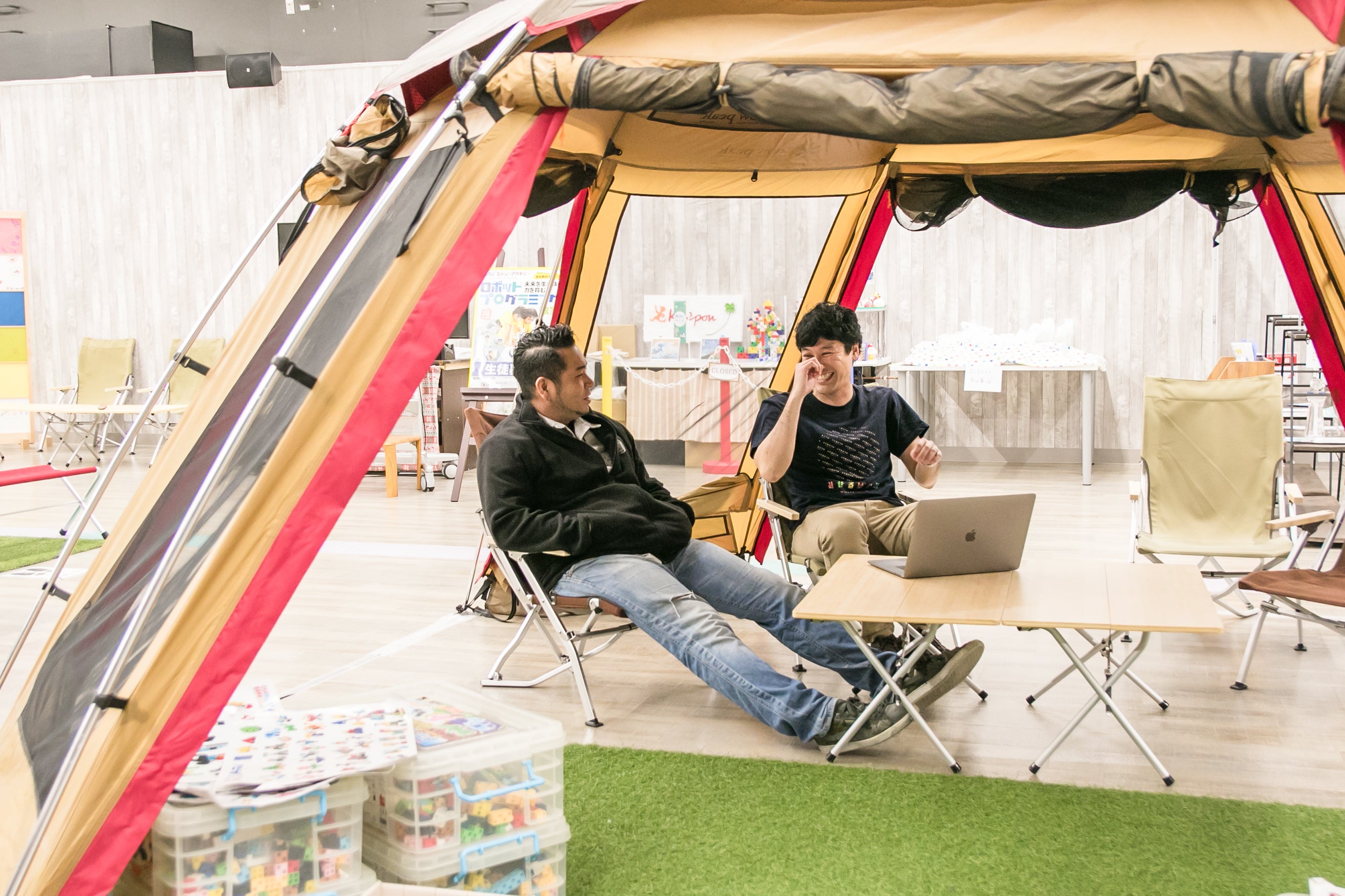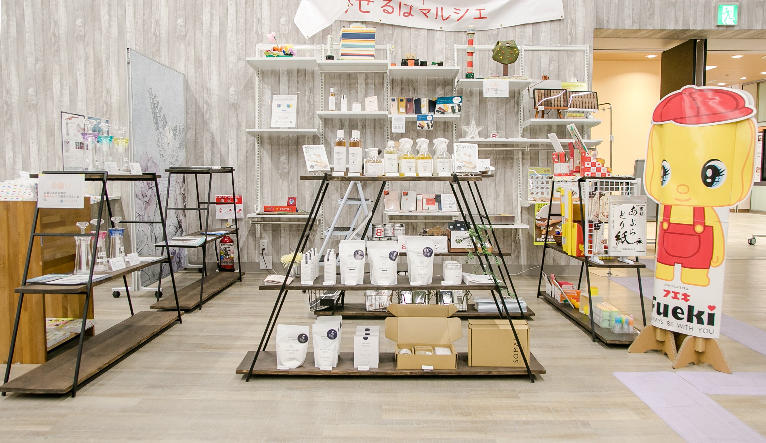 実は商品は有名だったりするけど、八尾の会社としてあまり知られていない企業もたくさんあります。ここに来れば八尾が地元である企業の製品に触れることができるんです。たとえば、黄色い犬のパッケージで有名な糊のフエキさんや、こだわりの洗剤で多くのファンがいる木村石鹸さん、子ども服で有名なミキハウスさんまで八尾の会社。まちの製品をこの場でも見てもらえるようブースも用意しています。」