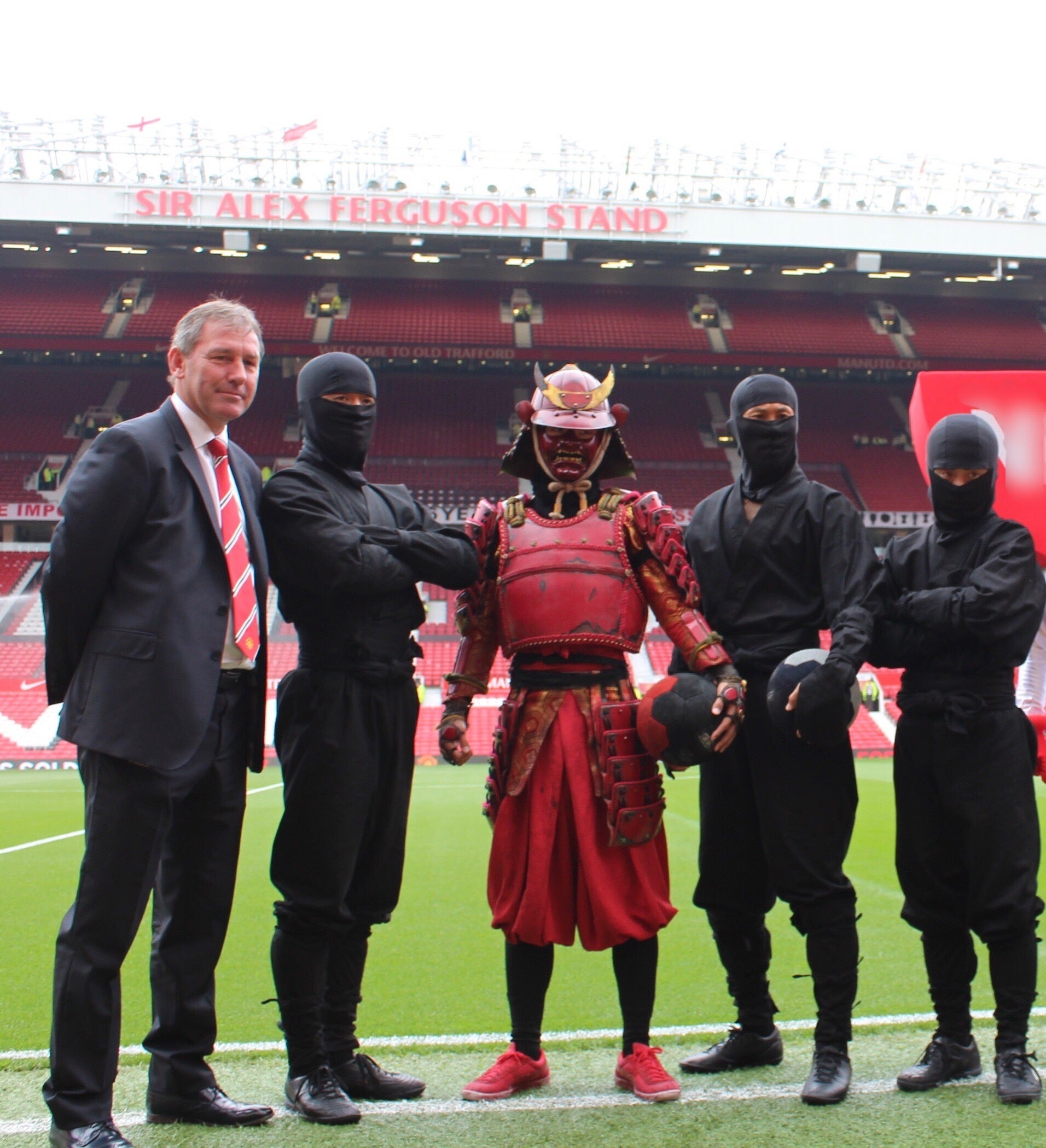 世界中のプロサッカー選手が夢見る舞台、マンチェスター・ユナイテッドのホームグラウンド『オールドトラフォード』にて、公式戦のハーフタイムショーとして、侍と忍者姿で出演。76,000人の大観衆の中、パフォーマンスは大成功し、割れんばかりの拍手喝采を頂戴したのです。「これはもしかしたら、プロサッカー選手でもなかなか体験できることではないのでは」…?この時、球舞を作って活動を続けてきて良かったと心底思いました。