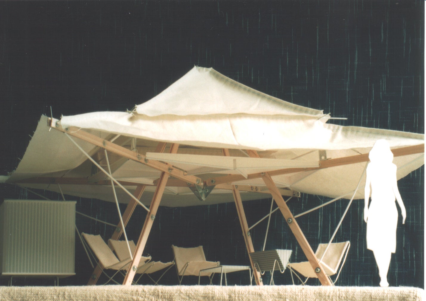 また、このノマディック・ルーフを将来的には『災害時の応急テント型仮設住宅』として、発展させて行きたいと考えています。 現状の大きさは、仮設建築物の許可対象にならない大きさとしていますが、可動式かつ折り畳み式でありながら、構造的には約10m角の大きさ、約100㎡の大きさにする事も可能です。 まずは『プロトタイプ』を製作して、公共空間の快適な使い方を提案すると同時に、イベント等を通じたデモンストレーションで、ノマディック・ルーフの『可能性を伝えて行きたい』です。