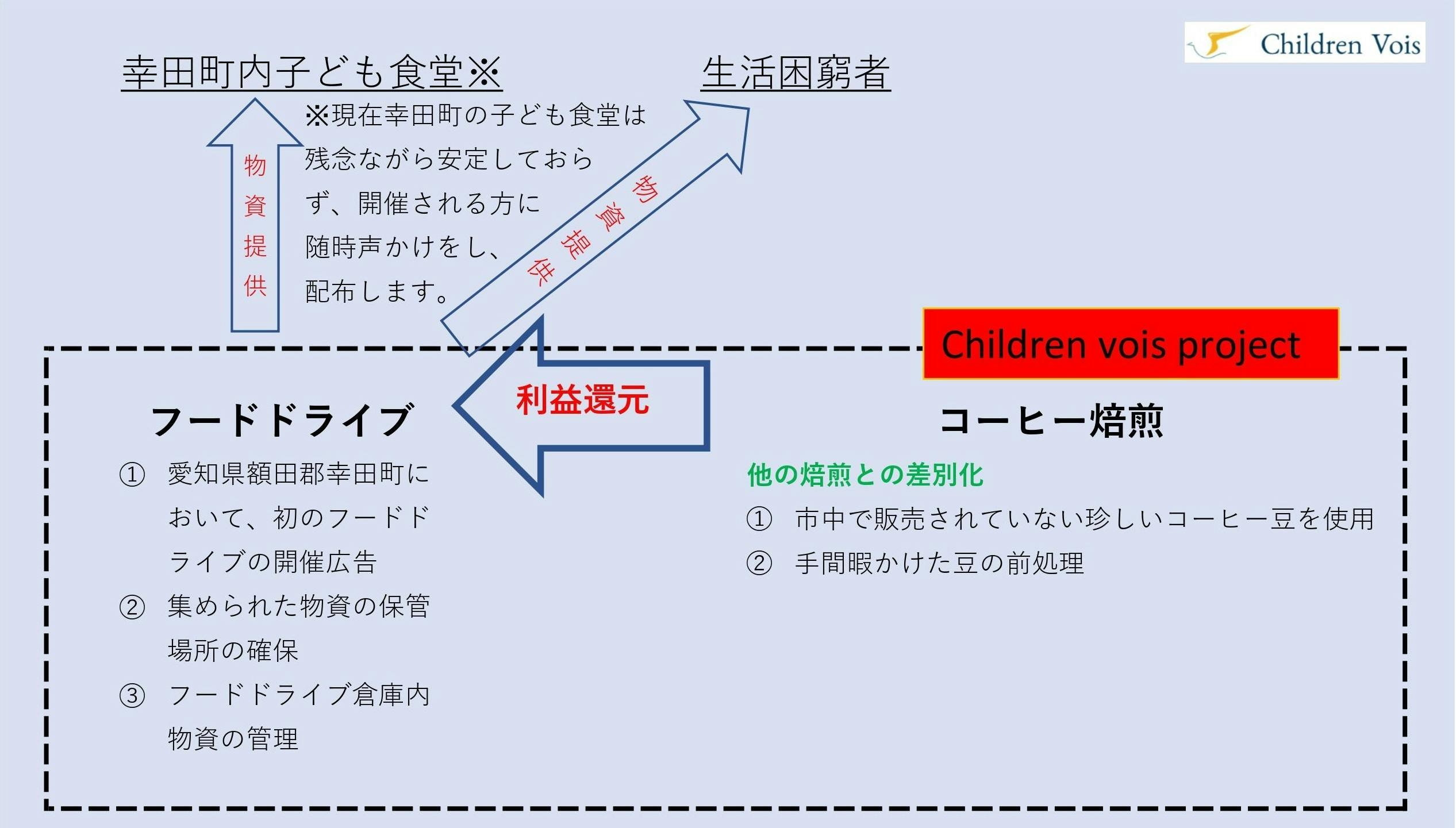 ボランティアであるフードドライブと、コーヒー豆の焙煎業を同時に行うというものです。