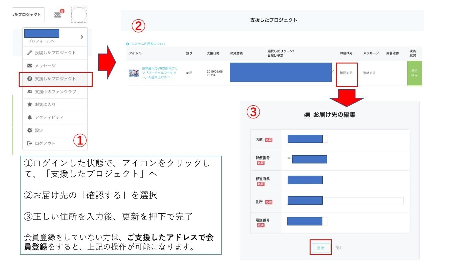 A:会員登録を行いログインした状態で、ご自身のアカウントをクリックして頂き、支援したプロジェクト一覧の中からお届け先の変更が可能です。