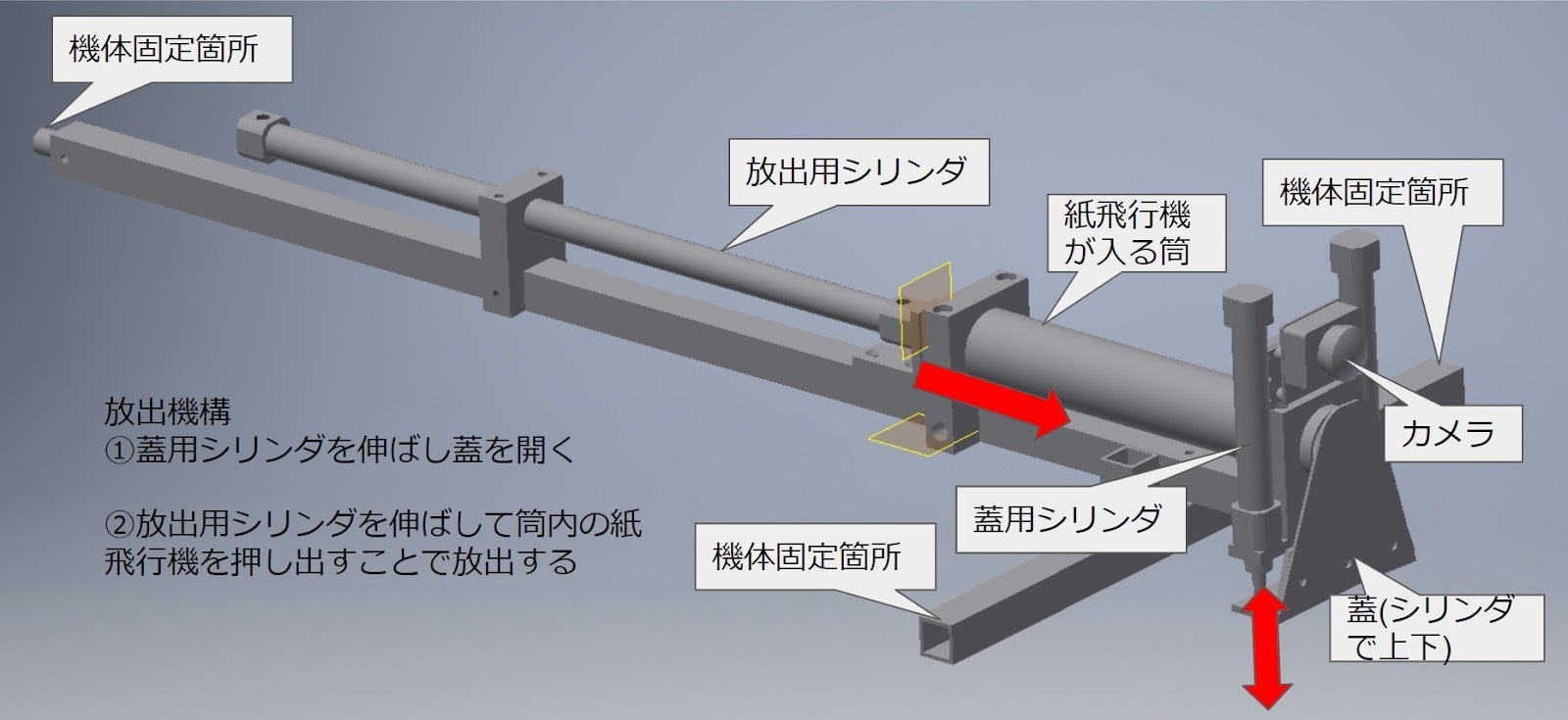 折り紙飛行機射出のための放出機構も開発しました。この部分がMOMO3号機との最大の違いになります。