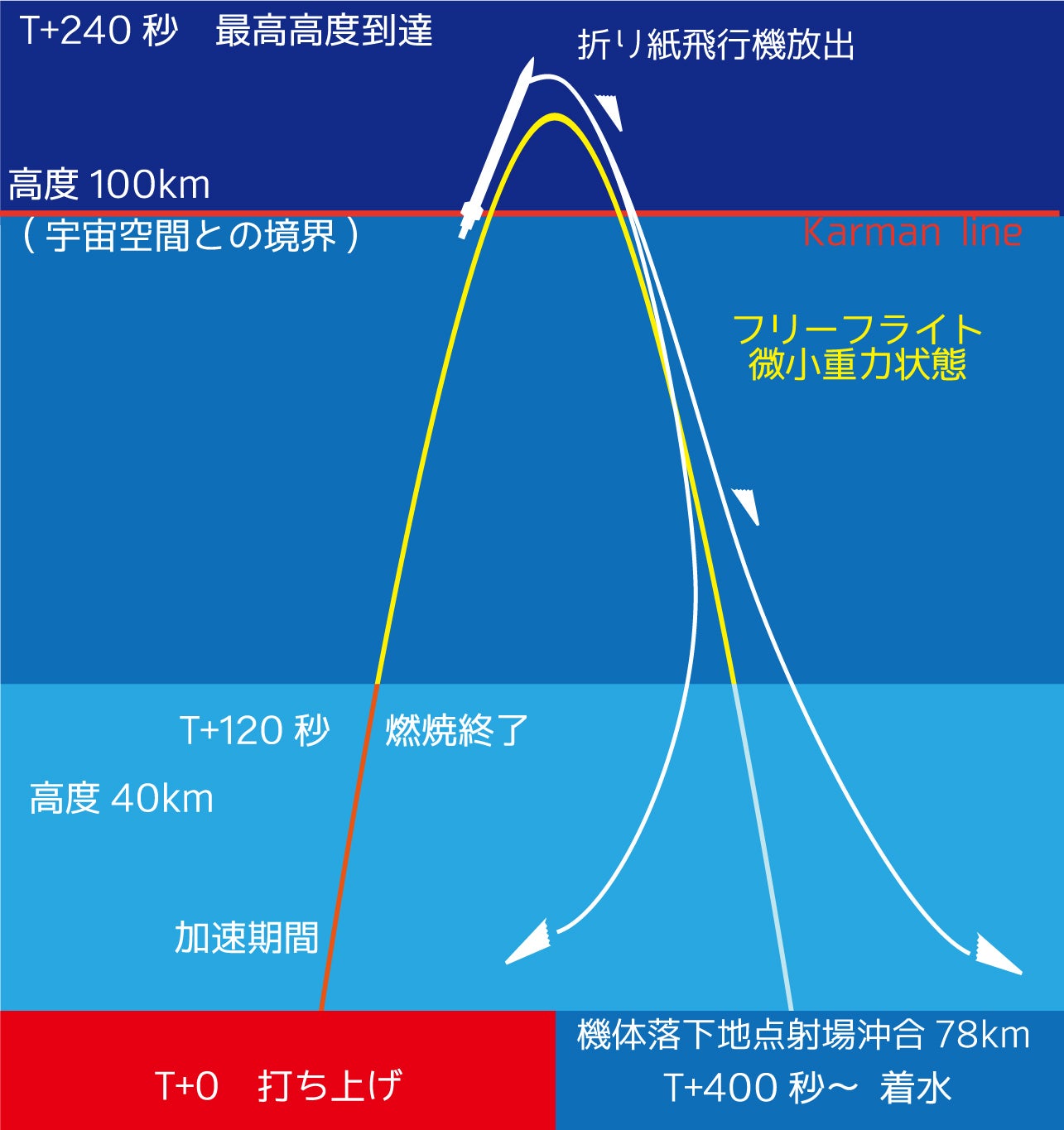ペイターズドリーム MOMO4号機によって、高度100km以上の宇宙空間まで折り紙飛行機を運び、そこで放出します。折り紙飛行機は宇宙空間から落下し、大気圏に再突入し、地表まで飛行、降下します。