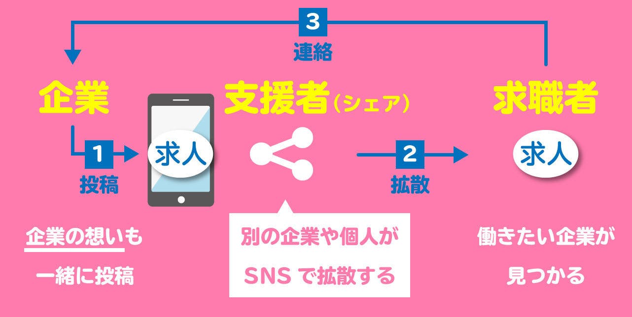 そこで目を付けたのがSNSです。SNSを使ってみんなで企業を応援する、企業が求めている人材・企業の理念・企業の熱い想いをSNSで拡散させる。そんな求人サイトを作ろうと考えました。