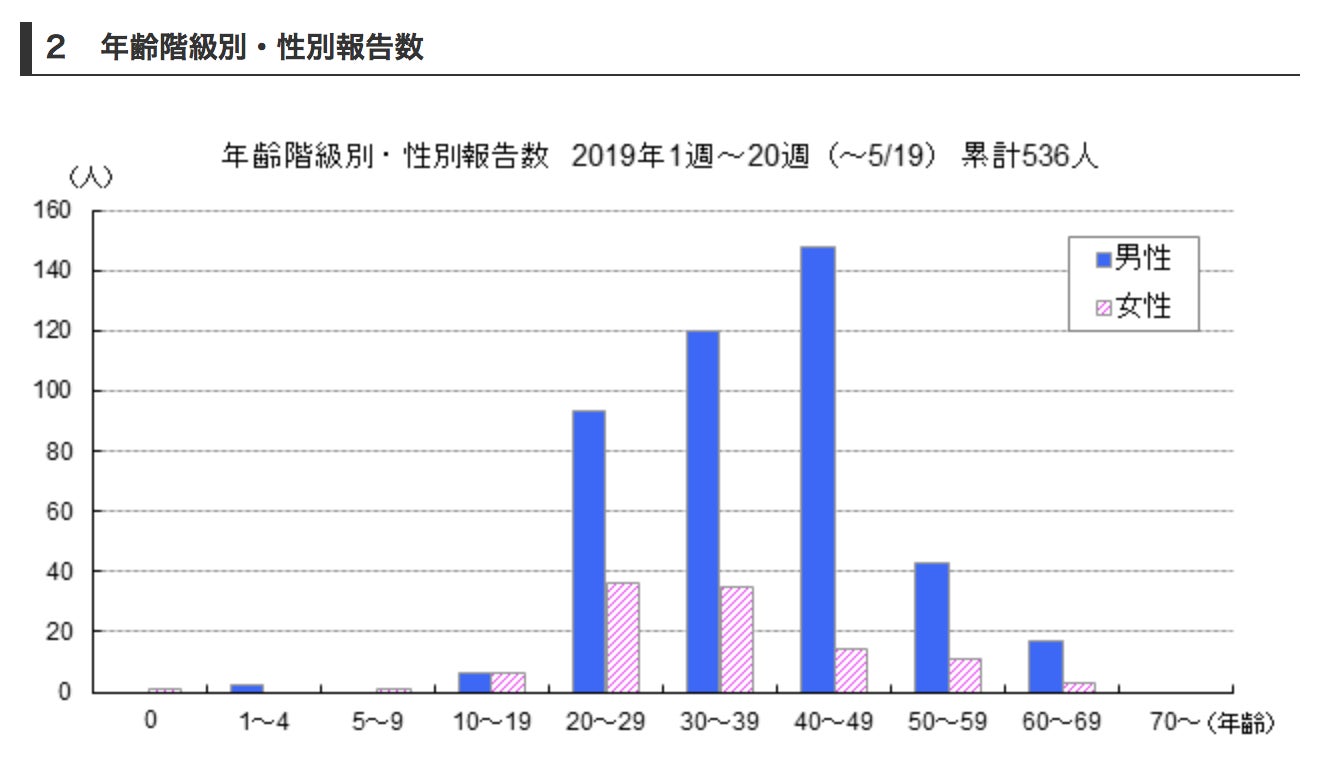 下は2019年5月19日までの東京都の年代性別別の風疹感染者のグラフです。
