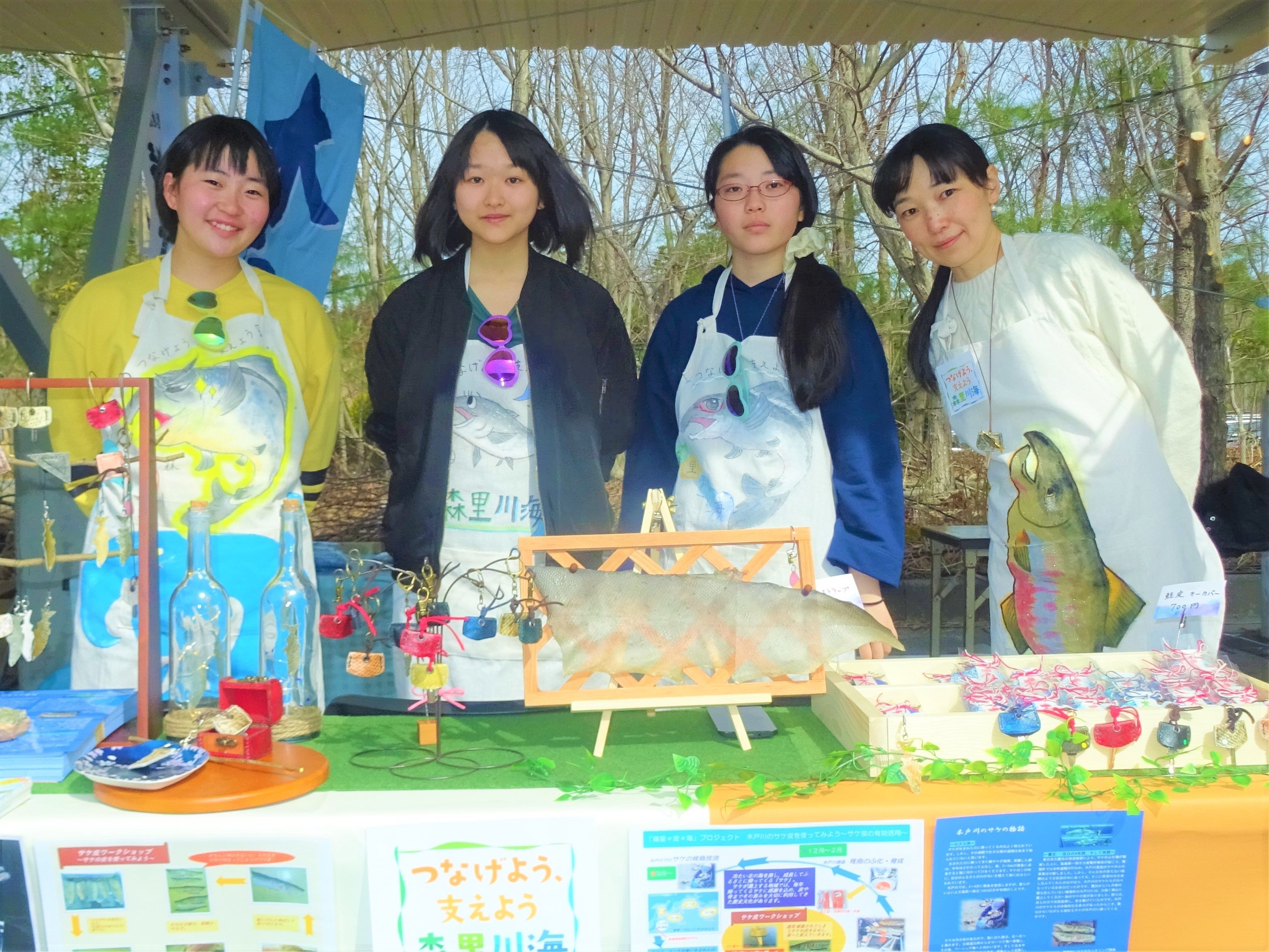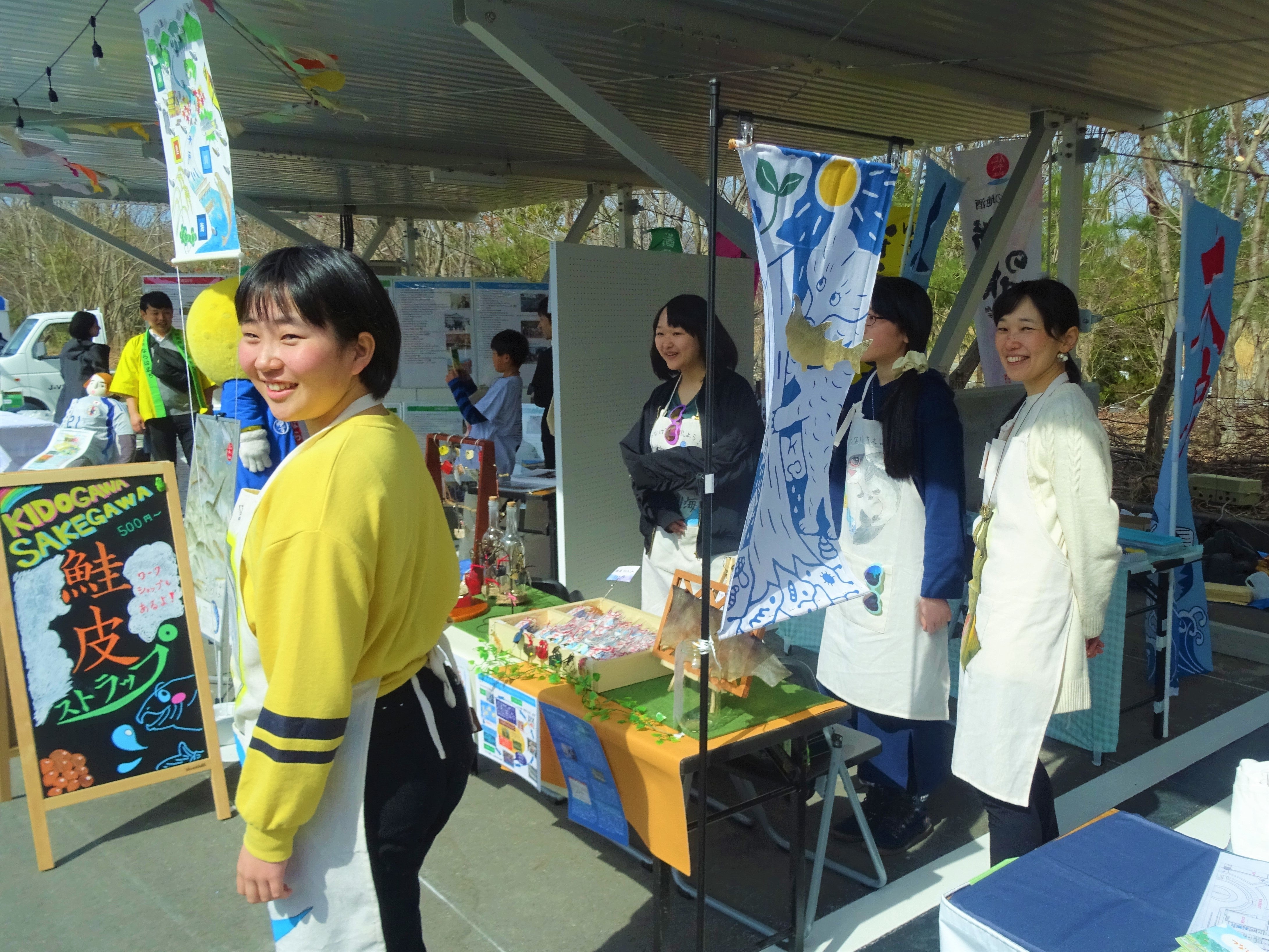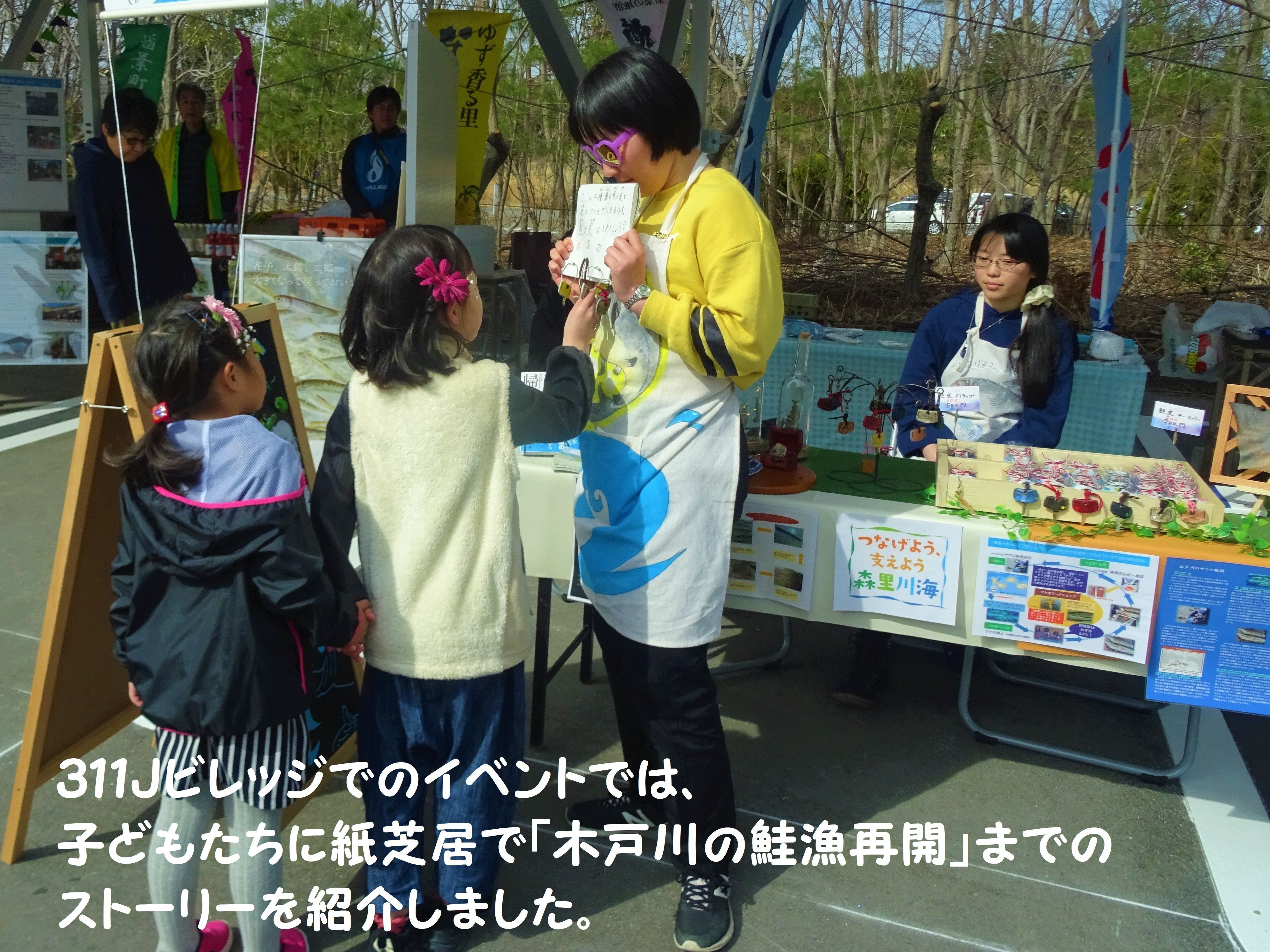 私たちは、今年の3月福島県のJビレッジで開催された復興イベントにブース出展し、「森里*皮*海プロジェクト」というチーム名で出震災を越えて鮭漁を再開させるまでのストーリーや、実際に木戸川に戻ってきた鮭の皮を使ったアクセサリーを作って、「木戸川の鮭」の復活をPRしました。