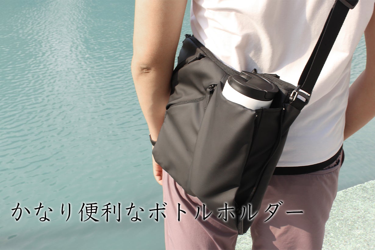 ペットボトルや水筒を持ち歩く人は、まさにベスティーにぴったり。こちらはファスナーで開く隠しマチ付きで、必要ない時はフラットポケットとしても使えます。