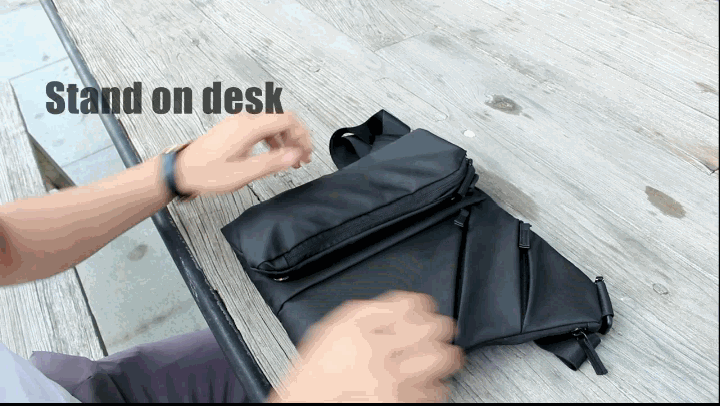 ですがベスティーには、メッセンジャーバッグの折り畳み部分を広げて、自立させるスタンド機能があります。