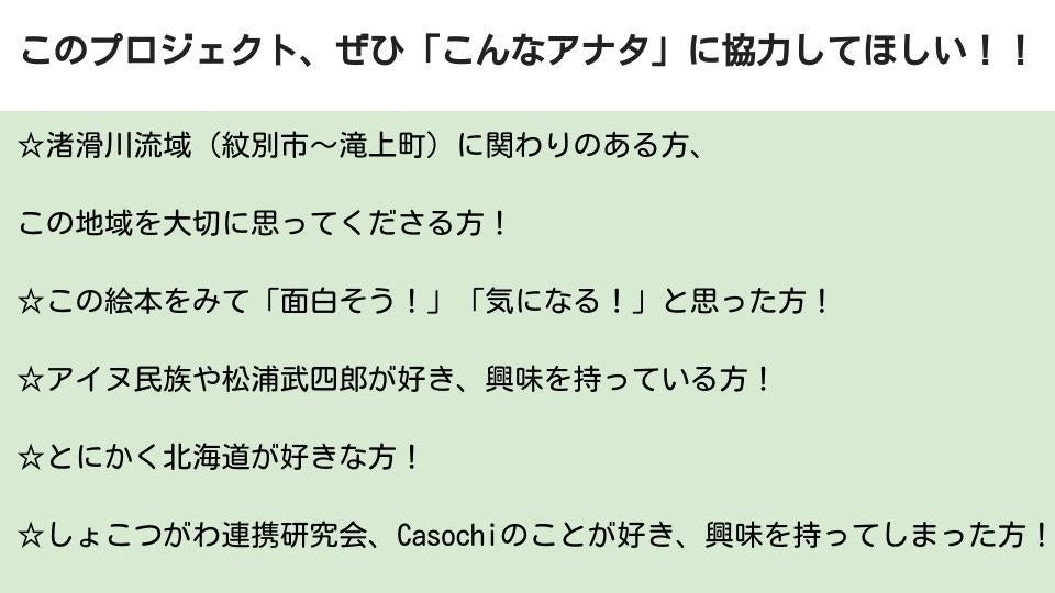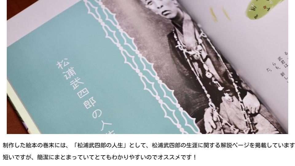「北海道オホーツク地域の渚滑川を舞台に、北海道の名付け親でありアイヌ民族と深く関わった探検家松浦武四郎のストーリーを描いた絵本をたくさんの人に読んでほしい!」