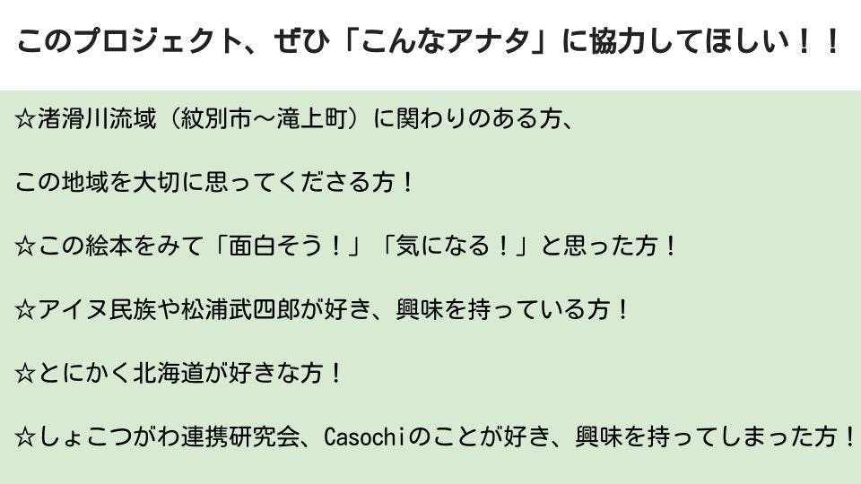 しょこつがわ連携研究会が制作した、松浦武四郎が渚滑川に訪れた際のエピソードを描いた絵本をこどもたちをはじめ、多くの人に届けたい!そして、舞台となった渚滑川、紋別~滝上地域の魅力を発信するしょこつがわ連携研究会を応援してほしい!そんな思いで立ち上げたプロジェクトです!