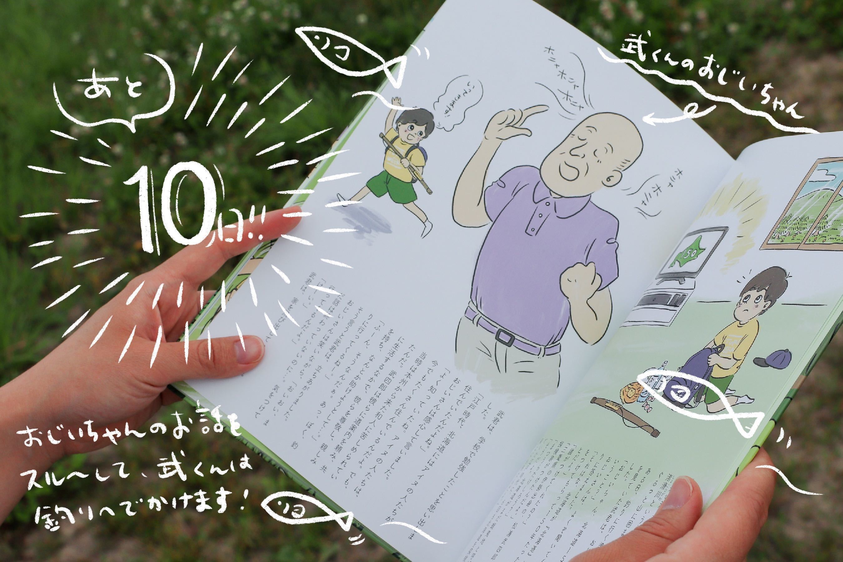 8月も残り1/3、このクラウドファンディングも残り10日となりました!!本日の投稿画像は、物語の2ページめ。主人公の武くんが北海道150周年について問いかけたのをいいことに、武くんのおじいちゃんが北海道のこと、アイヌのこと、松浦武四郎のことについて、張り切っておしゃべりをはじめるシーンを紹介しています。おじいちゃんの長い話を聞き流し、意気揚々と渚滑川へ釣りに出かける武くん。さてこの後起こる出来事とは…??ここからどうやって松浦武四郎とショコツアイノが登場するのでしょう??「松浦武四郎が実際に渚滑川を辿って滝上町に訪れ、ひとりのアイヌと出会った逸話を、どうやってこどもたちにもわかるように伝えるか。」それを叶えるために制作したのがこの絵本です。そしてより絵本らしく、面白く、この話を伝えるために考え出したストーリー。タイトルの"ふしぎな出会い”にあるとおり、この後にはなんともファンタジックな展開が待っているんですよ…!!続きもどうぞお楽しみに^^