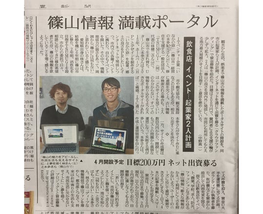 2017/02/03 18:01読売新聞の丹波欄に篠山ポータルサイトの取り組みが大きくカラーで掲載されました! 今回の我々の取り組みが地元の人たちにもっと広まり、他人事ではなく"自分事"としてみんなで一緒にポータルサイトを完成させられればいいなと思います。 最近はこの取り組みをご存知の方から「期待している」という声をかけていただくことが多くあります。期待に応えられるよう、最強の地方ポータルサイトを作っていきたい所存です。 募集期間が1ヶ月を切りましたが、ここからラストスパートを図りたいと思います。 みなさん、引き続き応援をよろしくお願いします!!! もっと見る