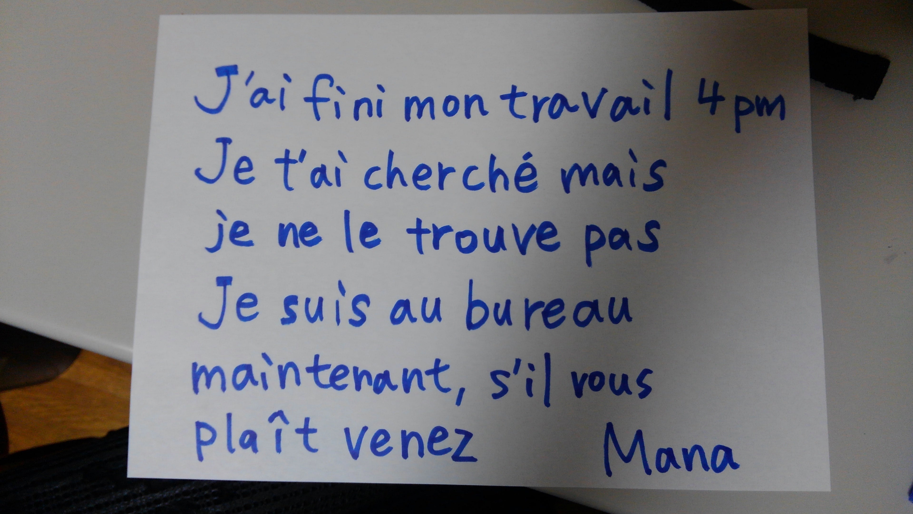 来てください まなこの怪しげなフランス語は、パソコンで翻訳した文章を、コピー用紙に書いて、会社の玄関に貼ったものです。