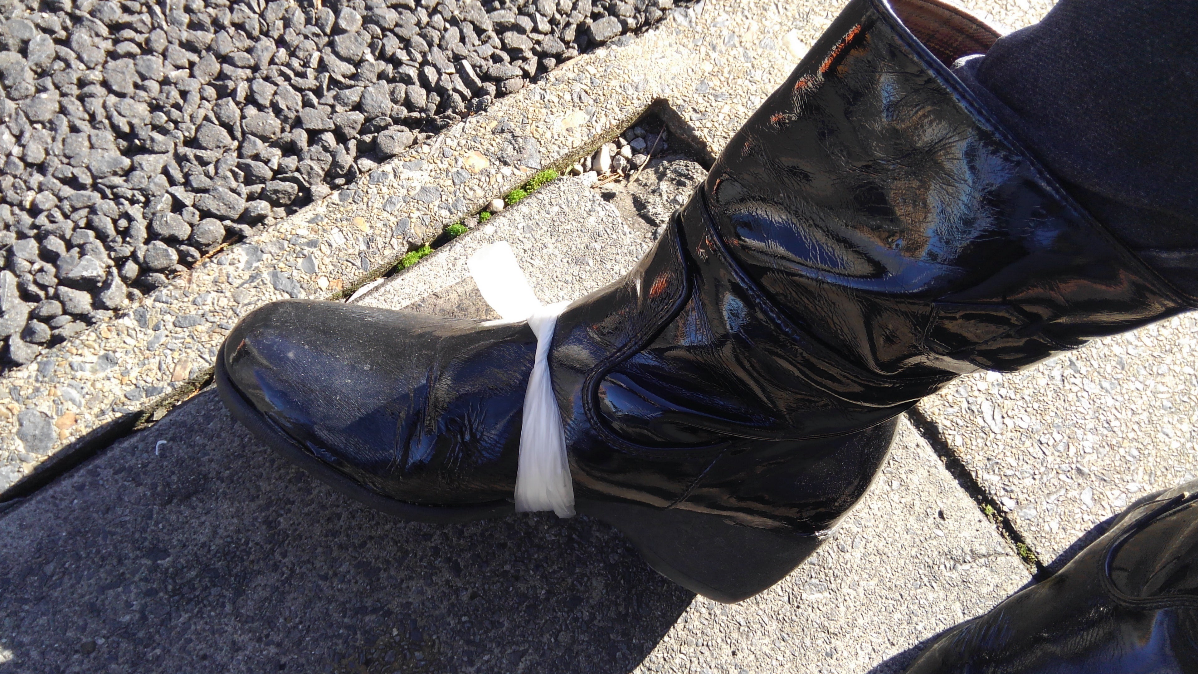 一軒目には売っていなかったので、違うコンビニに行こうとすると、アジズがキョロキョロと辺りを見回して、落ちていた傘用の細長いビニール袋で、私の靴を縛ったのです。