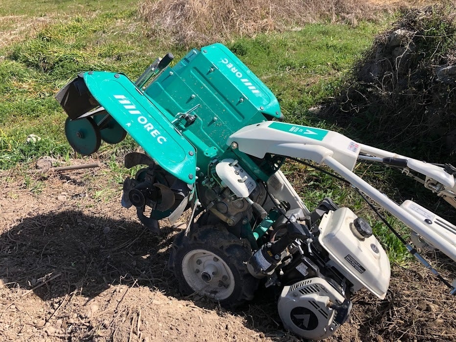 管理機という溝堀り機で、生姜の畝と溝を作ります