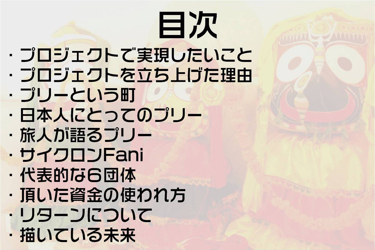 2019/12/30 20:53パトロンの皆様大変お世話になっております。予定より遅れてしまい申し訳ありません。クラウドファンディングの報告書が完成いたしました。この報告は皆様のメールの方にも送らせていただいております。念のためこちらにも報告させて頂きます。皆様のお気持ちが具体的な形となり、日本とインドをつなぐ活動に従事している団体・個人の施設の修繕が進んでおります。また、プリーの町もサイクロンを知らない人には被災したことすらわからないくらい、復興が進んでおります。皆様のお気持ちもあってのことです。改めて御礼申し上げます。報告書はデータ便に添付してお送りしました。お時間あるときに目を通して頂けたらと思います。報告書URL:http://dtbn.jp/kgl4ETXまた、日本へ送付するリターンだけでなくプリーやサンタナゲストハウス京都で受け取る形のリターンも徐々にお返ししております。リターンを受け取って頂く時期などのご相談も以下のメールアドレスまでご連絡をお願いいたします。プリーで受け取るリターンの連絡先info.indiasantana@gmail.comサンタナゲストハウス京都の連絡先reikodono@gmail.comまた、支援頂いた皆様に直接お礼をお伝えしたいという声がありました。プリーにお越しの際や日本でもサンタナゲストハウス京都やJagaレストランにお越しの際は一声かけて頂きたく存じます。サンタナゲストハウス京都https://indiasantana.net/kyoto/JagaレストランJAGA 武蔵小杉店https://tabelog.com/kanagawa/A1405/A140504/14047864/JagaレストランJAGA 新丸子店https://tabelog.com/kanagawa/A1405/A140504/14015238/以上となります。今後ともプリーを宜しくお願いいたします。良いお年をお迎えください。 もっと見る