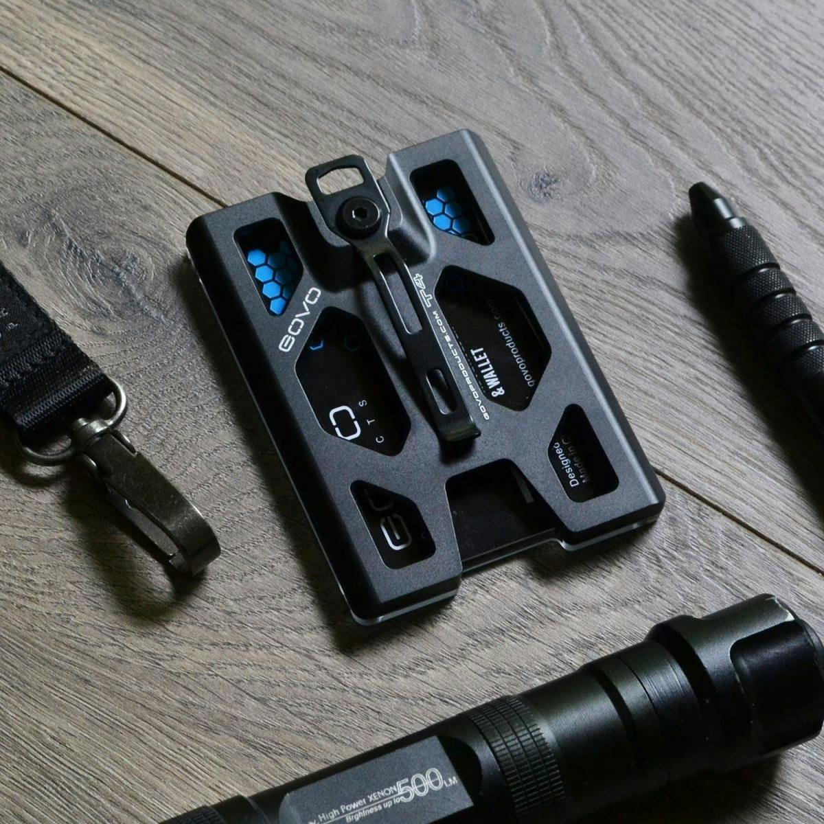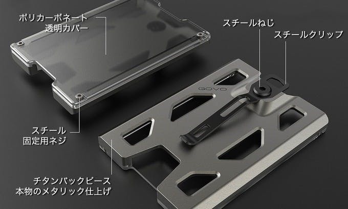 「GOVO」 IDホルダー&ウォレットは、どのような環境下でも耐えられるように設計されました。ポリカーボネートの使用により重量を増やさずに耐久性を高め、金属製のクリップはマンガン鋼とホルダーによって補強されています。最大のポイントとして、ケースに収納したカードは、その枚数に応じてグリップ力が調整される金属バネシステムによって固定されます。