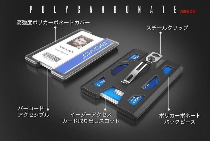 「GOVO」 IDホルダー&ウォレットをデザインする際に重要視したひとつの「耐久性」において、主な材料にポリカーボネートを採用することで、その精度を上げることに成功しました。ポリカーボネートとは、非常に強いタイプのプラスチックです。多くの製品で広く使用されているABS樹脂の40%を超える耐久性をもった素材で、プラスチックよりも広範囲な温度に耐えることができます。ポリカーボネート製のIDホルダーを制作、テストを重ねて、より優れた耐久性を追求。「GOVO」ではフロントカバーとバックピースにポリカーボネートを使用し、耐久性を各段にアップさせました。