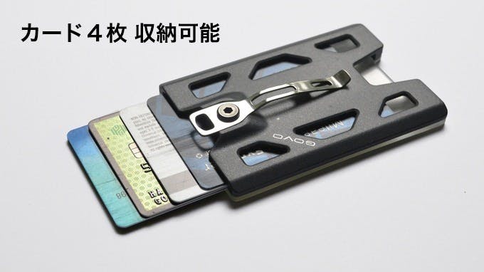 「GOVO」 IDホルダー&ウォレットは、最大4枚のカードを収納できます。その「カード・セキュア・システム」は、カードのみを搭載している場合、常に安全を保持します。