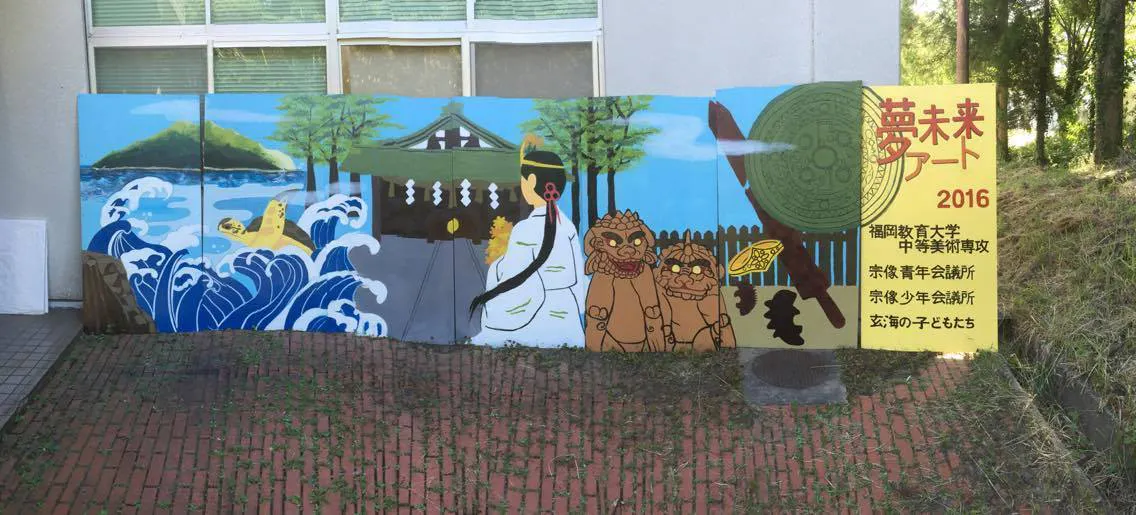 地元の学生で、宗像フェスの会場の防波堤に「世界遺産」「海」をテーマの壁画を描きました。