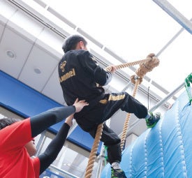 目の前にそびえたつ高さ5mの足場、ロープ、うんていなど、たくさんの障害物を知力・体力・運、