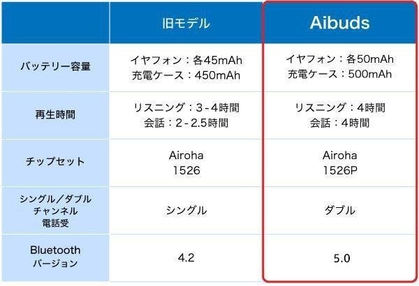 Aibudsは旧モデルの課題であった、再生時間やバージョンをアップデート。