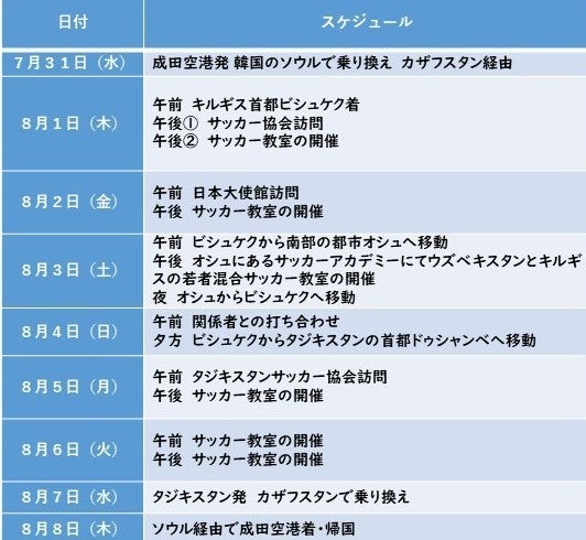 今回の柴村選手によるキルギスとタジキスタン来訪に当たっては各国のサッカー協会並びにプロリーグ協会から、全面的なサポートを得られる予定です。