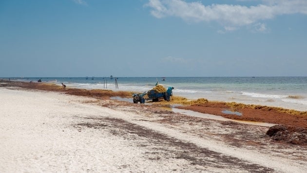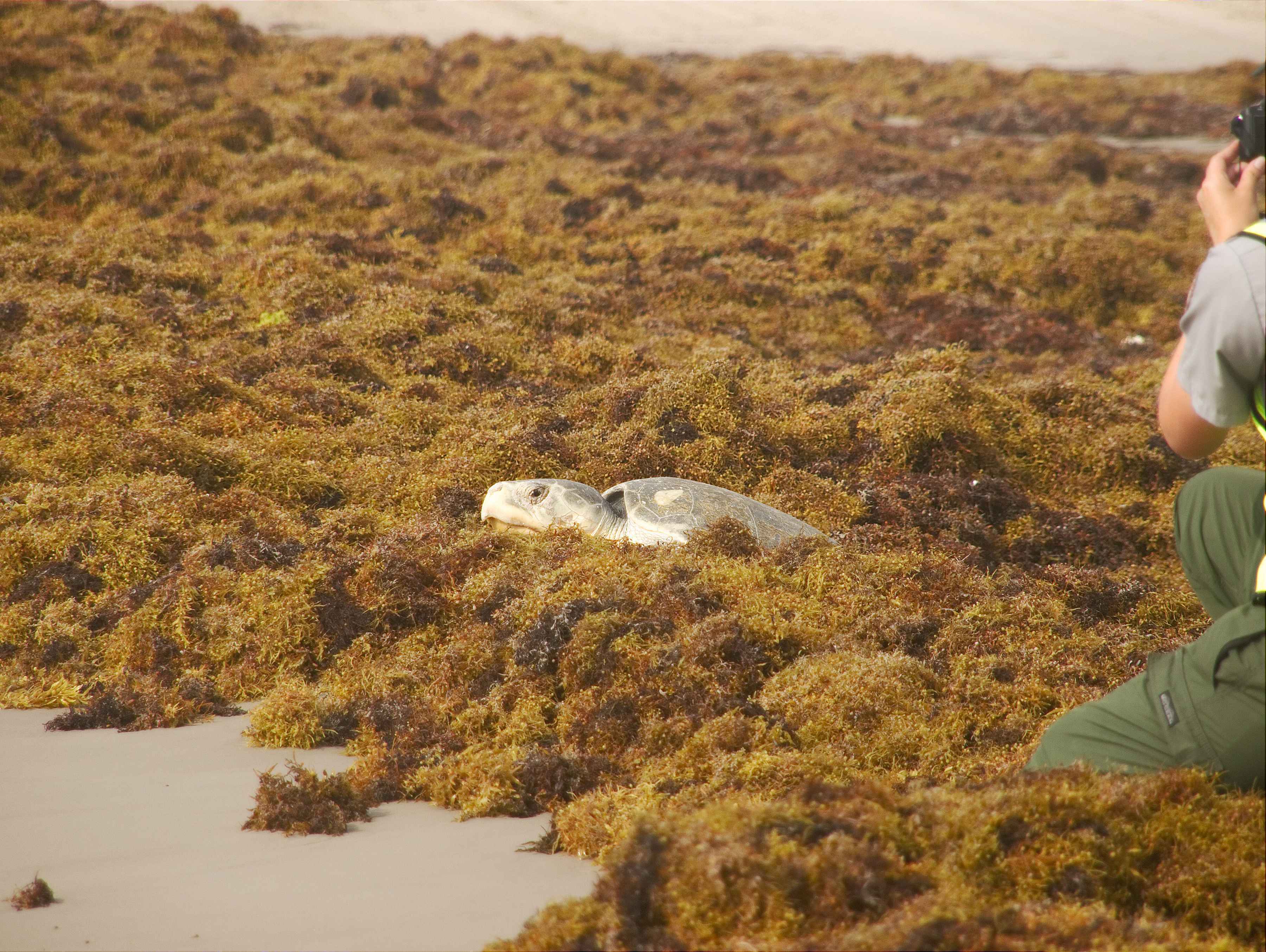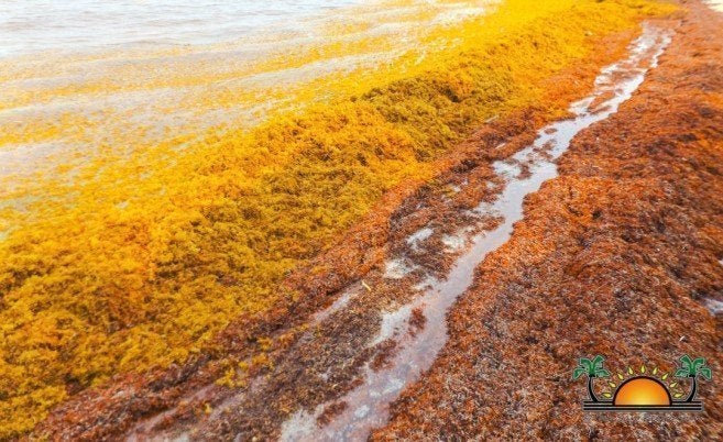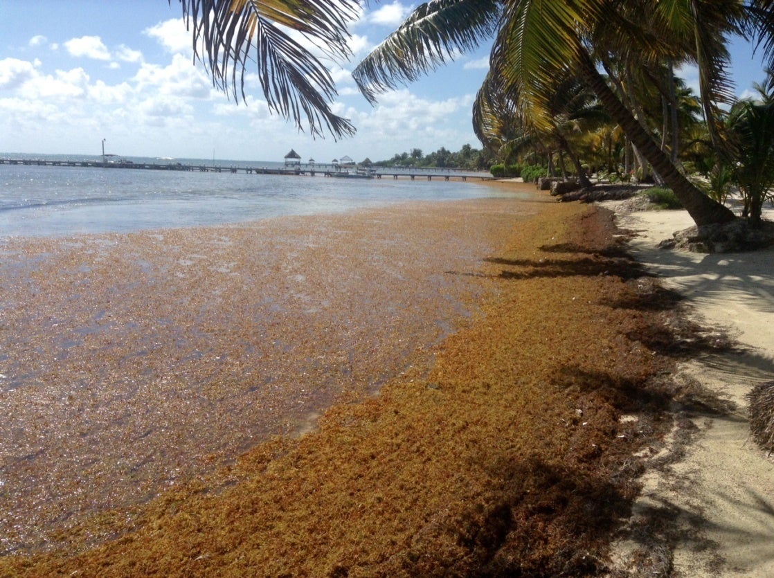 しかし、近年そのブルーホールを見に行くにも、空から「赤潮のようなものが見える」という声をいただくようになりました。それが、サーガッスム(ホンダワラ)です。サーガッスムは、元々北大西洋のサーガッソー海から季節によって海流に乗って流れてくるものでしたが、2011年の大漂着以来、2017年、2018年とその規模はどんどん拡大しており、2019年にはベリーズでサーガッスム非常事態宣言がなされました。東カリブ海のバルバドスでは、過去8年でサーガッスムの繁殖が200倍になったとの報告も出ています。