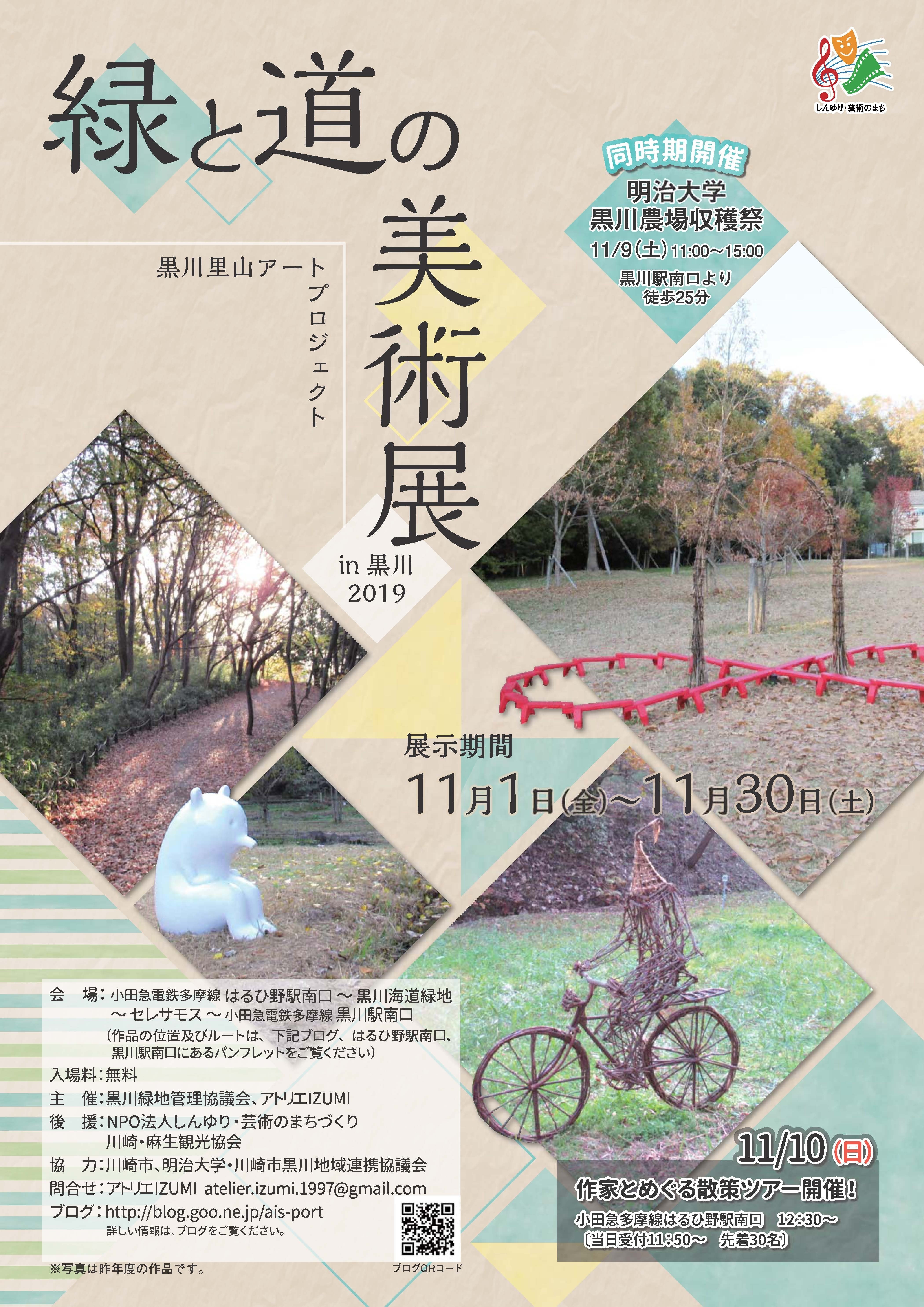 「緑と道の美術展in黒川2019」は、11月1日~30日までの1ヶ月間開催されています。小田急電鉄多摩線はるひ野駅→セレサモス→黒川駅をめぐるコースで、作品の場所は、はるひ野駅南口ロータリー、黒川駅南口階段下付近、JA大型直売所セレサモス黒川店で無料で配布しているパンフレットをご覧下さい。