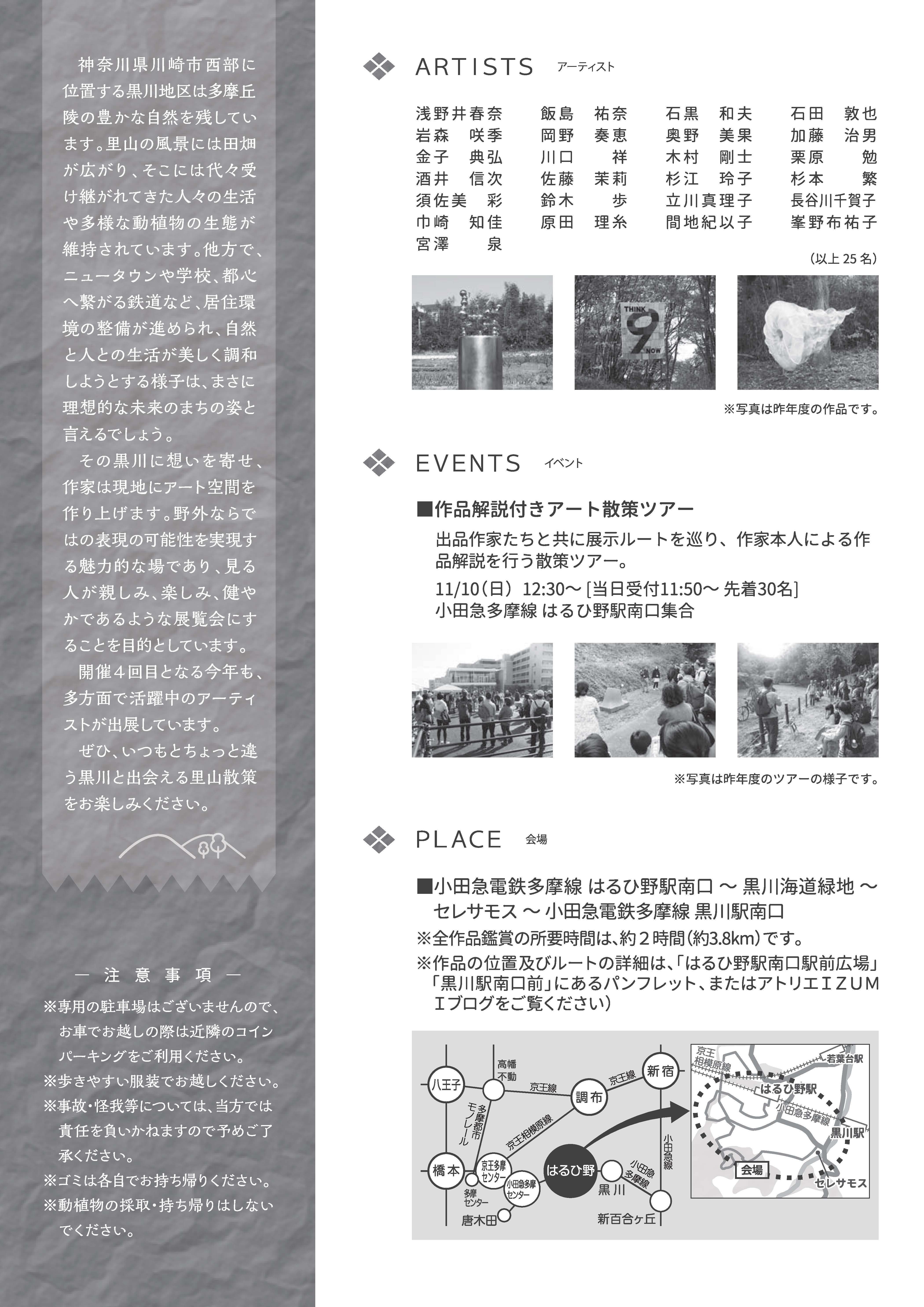 先ほどの黒川緑地管理協議会が主催する笹刈り体験イベントには、近隣にお住まいの皆さんを始め、この美術展に参加している作家さんの有志も参加してくれており、作品を置くその周辺の環境づくりにも関わっています。