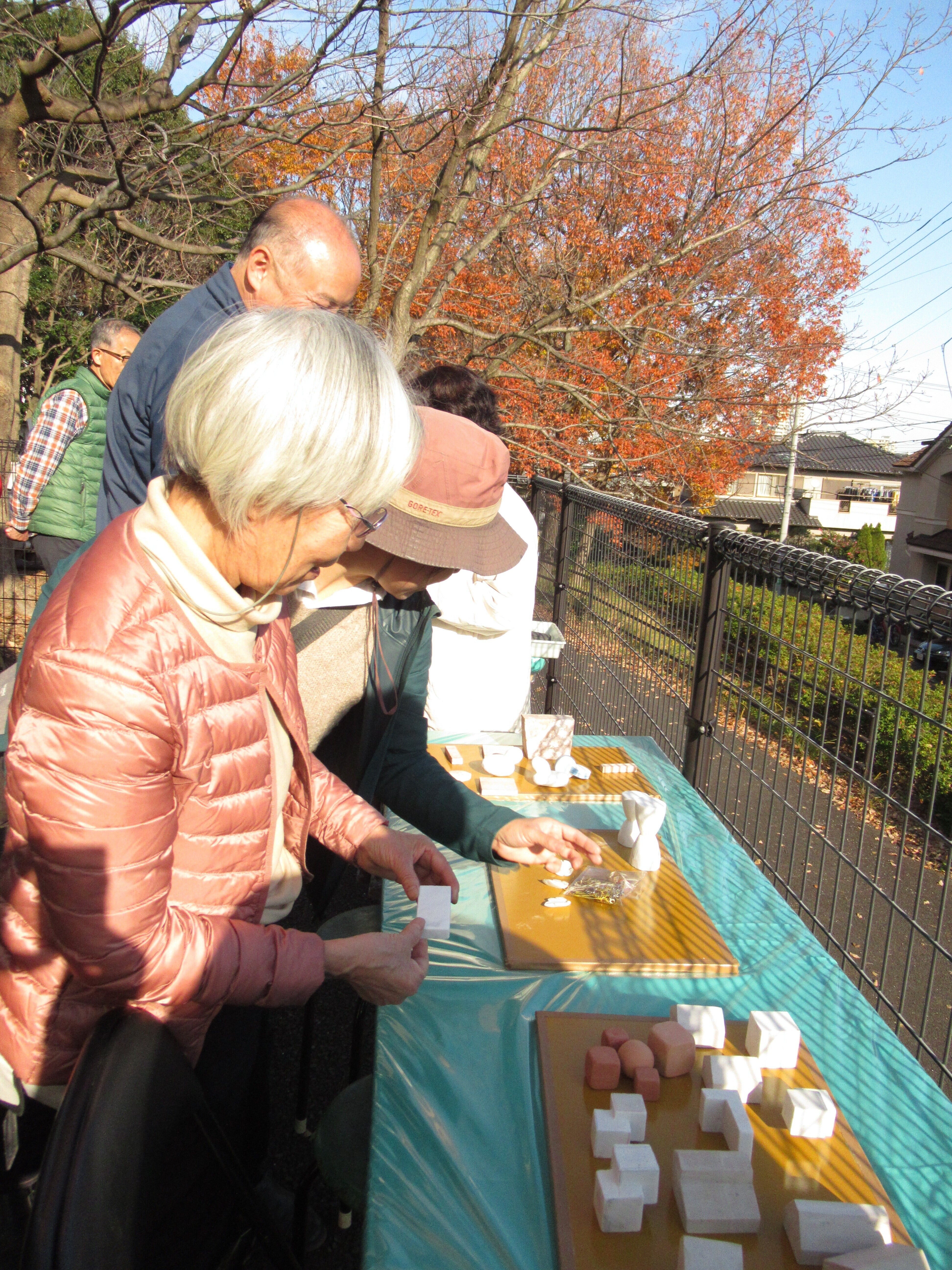 少し寒いけど、紅葉を見ながら外での開催!日差しを感じながら、石との対峙の時間の始まりです。