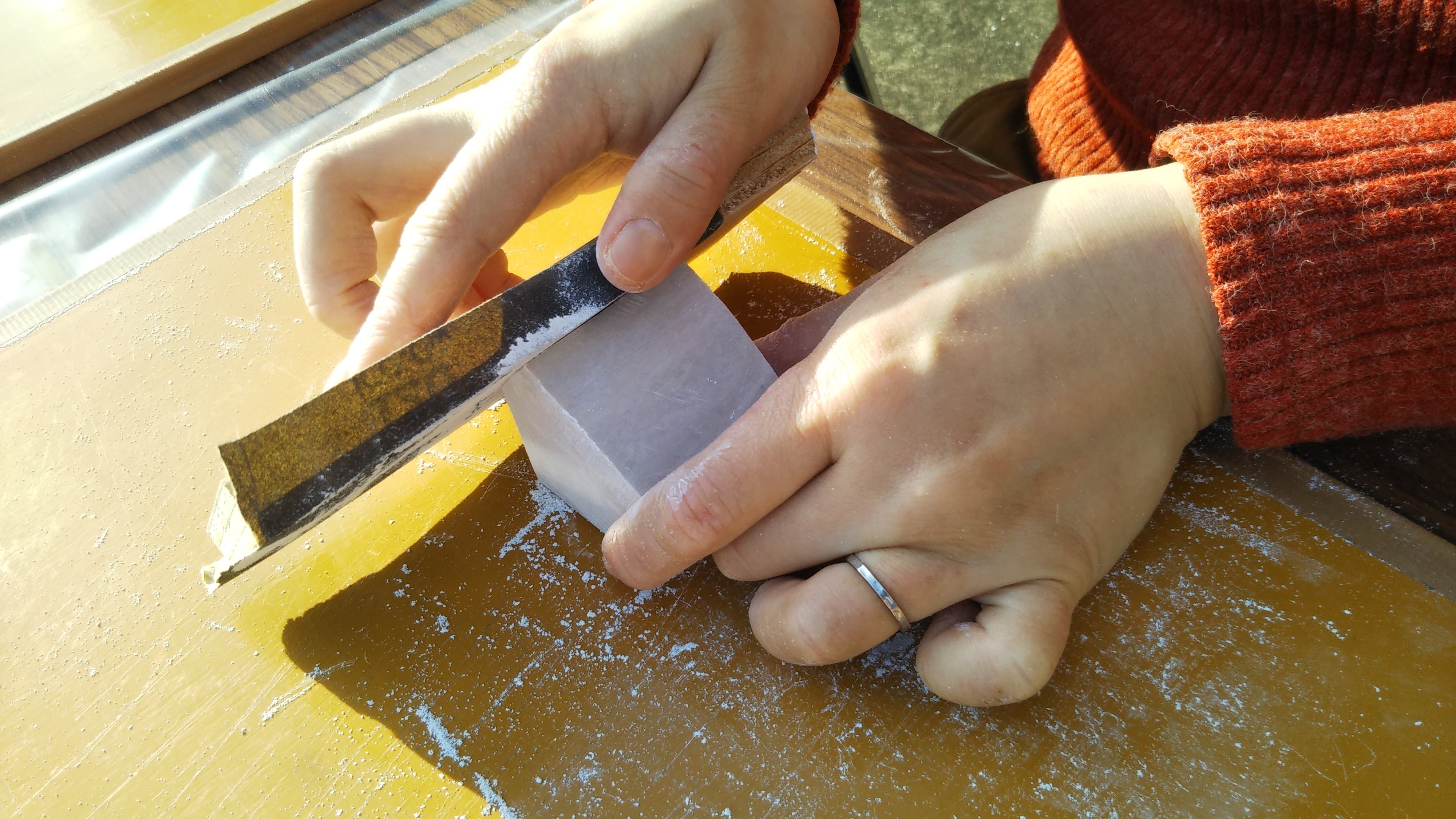 石の種類には大きくサンゴ礁からできたものと、火山の噴火でできたものがある、とか、大理石によくアンモナイトの化石があるのは海にあったから、とか、火山の噴火でできたものは、深い部分は土圧がかかって硬い石になるけど、浅い部分にあった石は加工しやすい、とか、真鶴に小松石の産地があって・・・などなど、石の知識が広がったり、同じ大理石でも色や硬さが違うことを体感するなど、「石の個性」を感じた1日となりました。