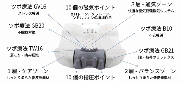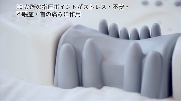 リラクゼーション効果のある深い指圧刺激と、磁気パルスによるホルモンバランスの安定化によってストレス、不安を軽減し、不眠症対策、首や肩回りのコリや痛みを緩和するように設計されています。