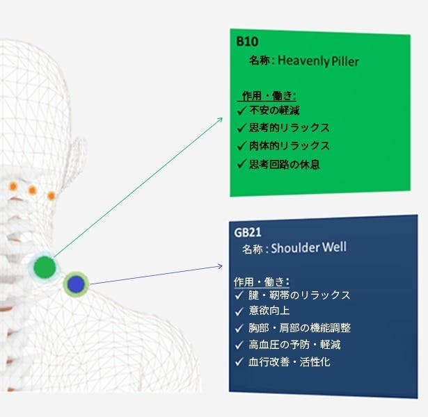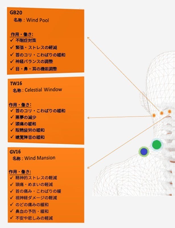 人体の中でも特に重要な首の周りには5種類・10か所の重要なツボが存在していて、これらを指圧ポイントでマッサージする事で神経や筋肉、腱、靭帯、血管に対して良質な刺激を与えます。