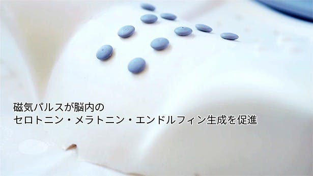 頭部に配置された磁石の磁気パルスは神経経路の伝導率に作用して、脳内にセロトニン・メラトニン・エンドルフィンの生成を促します。