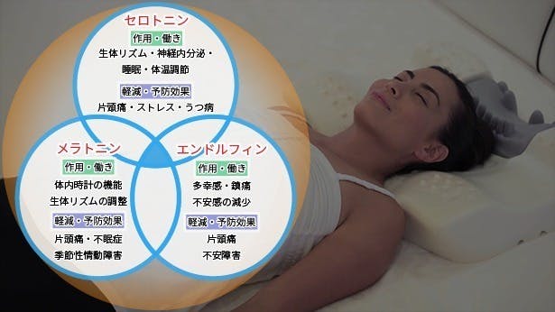 セロトニンには、片頭痛、ストレスおよびうつ病に効果があり、メラトニンは体内時計を改善し、片頭痛、不眠症、季節性情動障害などを緩和します。