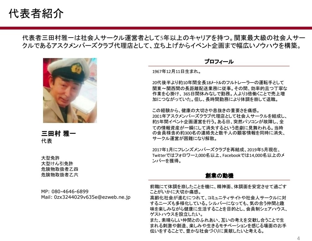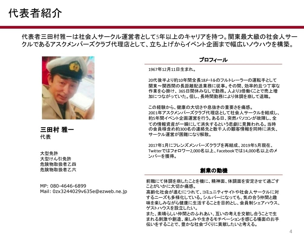 代表者三田村雅一は社会人サークル運営者として5年以上のキャリアを持つ。