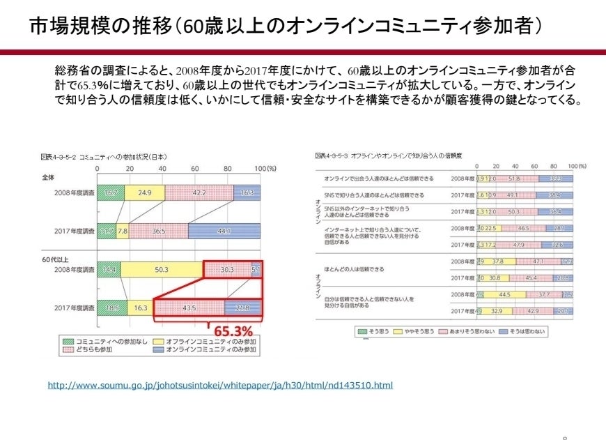 総務省の調査によると、2008年度から2017年度にかけて、60歳以上のオンラインコミュニティ参加者が合計65.3%に増えており、G0歳以上の世代でもオンラインコミュニニティが拡大している。
